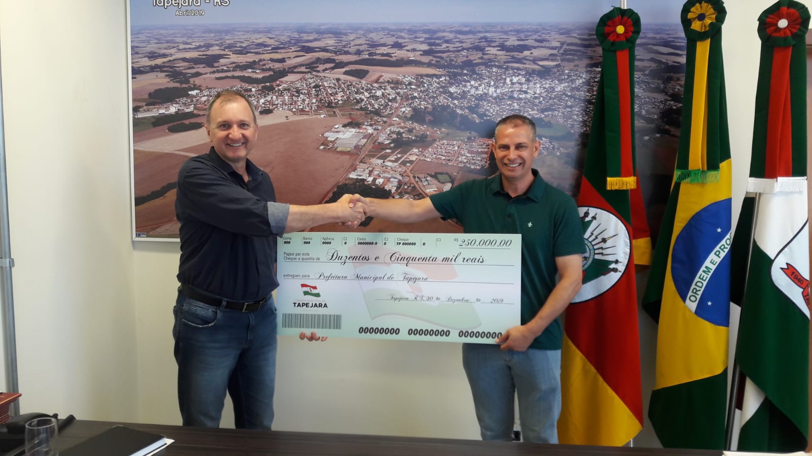 A Câmara de Vereadores de Tapejara devolveu R$600 mil para a Prefeitura Municipal de Tapejara. Destes, R$350 foram devolvidos ainda em setembro de 2019 para serem investidos em câmeras de videomonitoramento e, na manhã de hoje, terça-feira (24), mais R$250 mil, para investimentos em pavimentação de ruas do município.