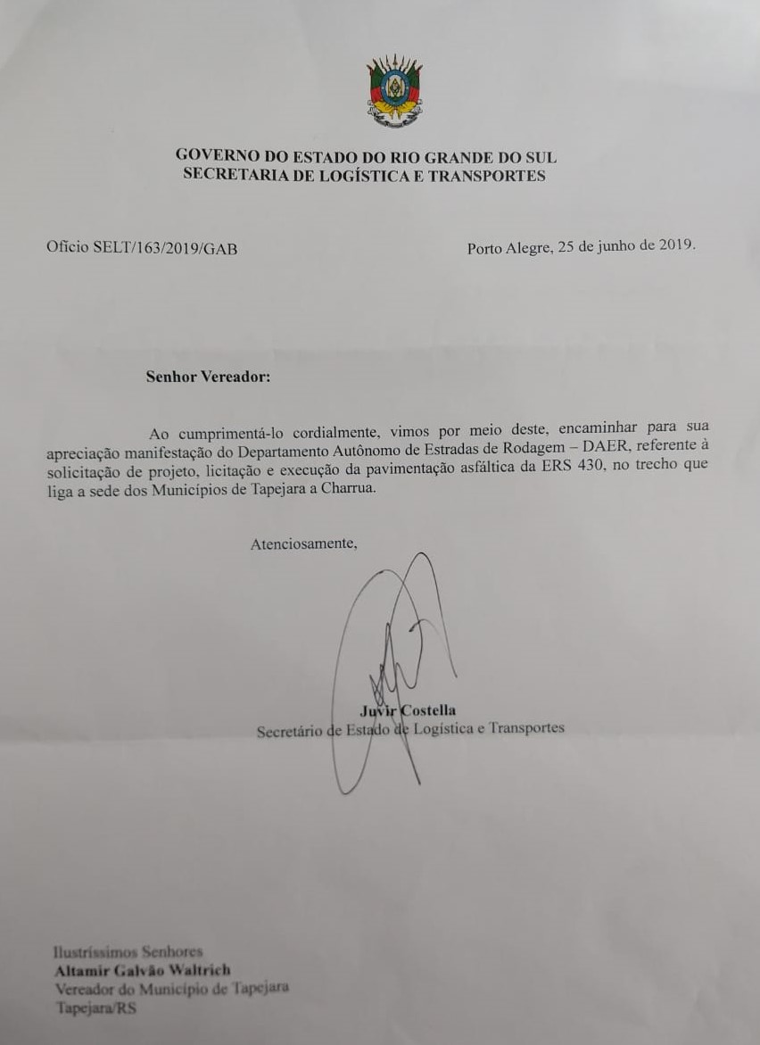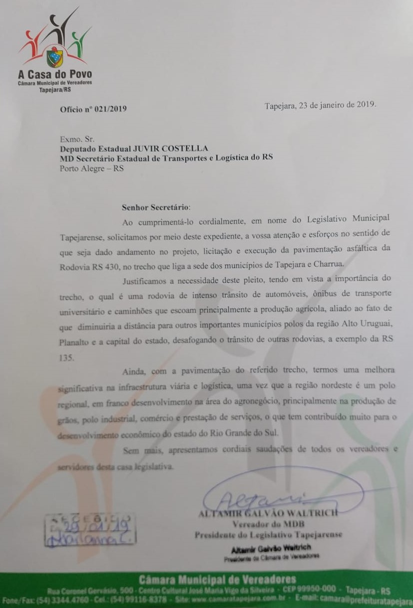 A Câmara de Vereadores através do presidente, Altamir Galvão Waltrich, recebeu retorno de uma solicitação de informações referente ao início das obras de pavimentação da ERS 430, que liga Tapejara a Charrua. Esta solicitação havia sido feita ainda em janeiro deste ano, durante audiência com o secretário de Logística e Transportes, Juvir Costella, o qual reconheceu a importância do pedido e ficou de retornar sobre previsão de execução da obra.