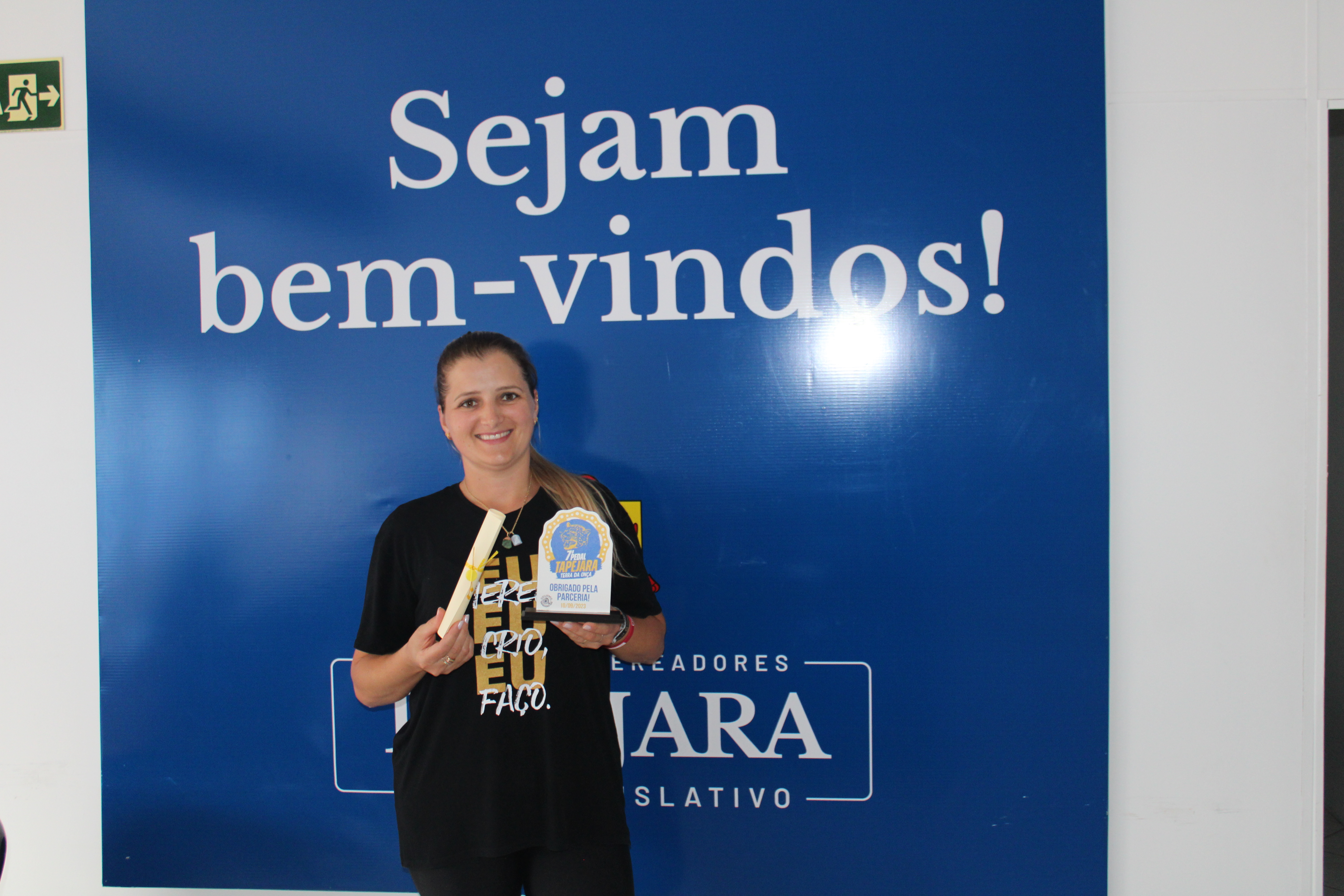 A Presidente Mariane Zanatta Favaretto do Ciclismo Tapejara, esteve entregando um troféu de agradecimento pela parceria da Casa do Povo com o evento realizado do 07º Pedal Tapejara Terra da Onça e 08ª Etapa do Circuito Planalto Médio de MTB.