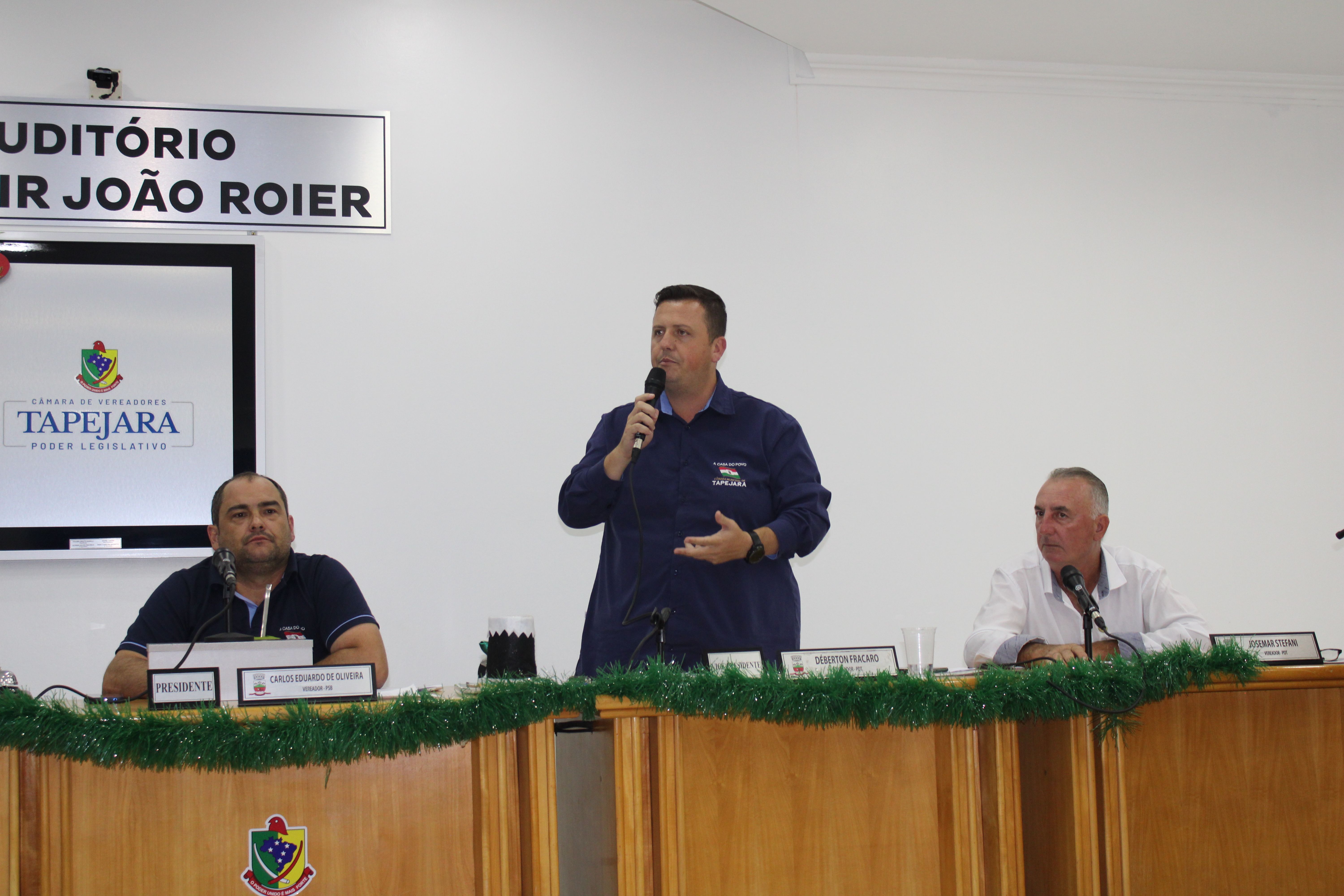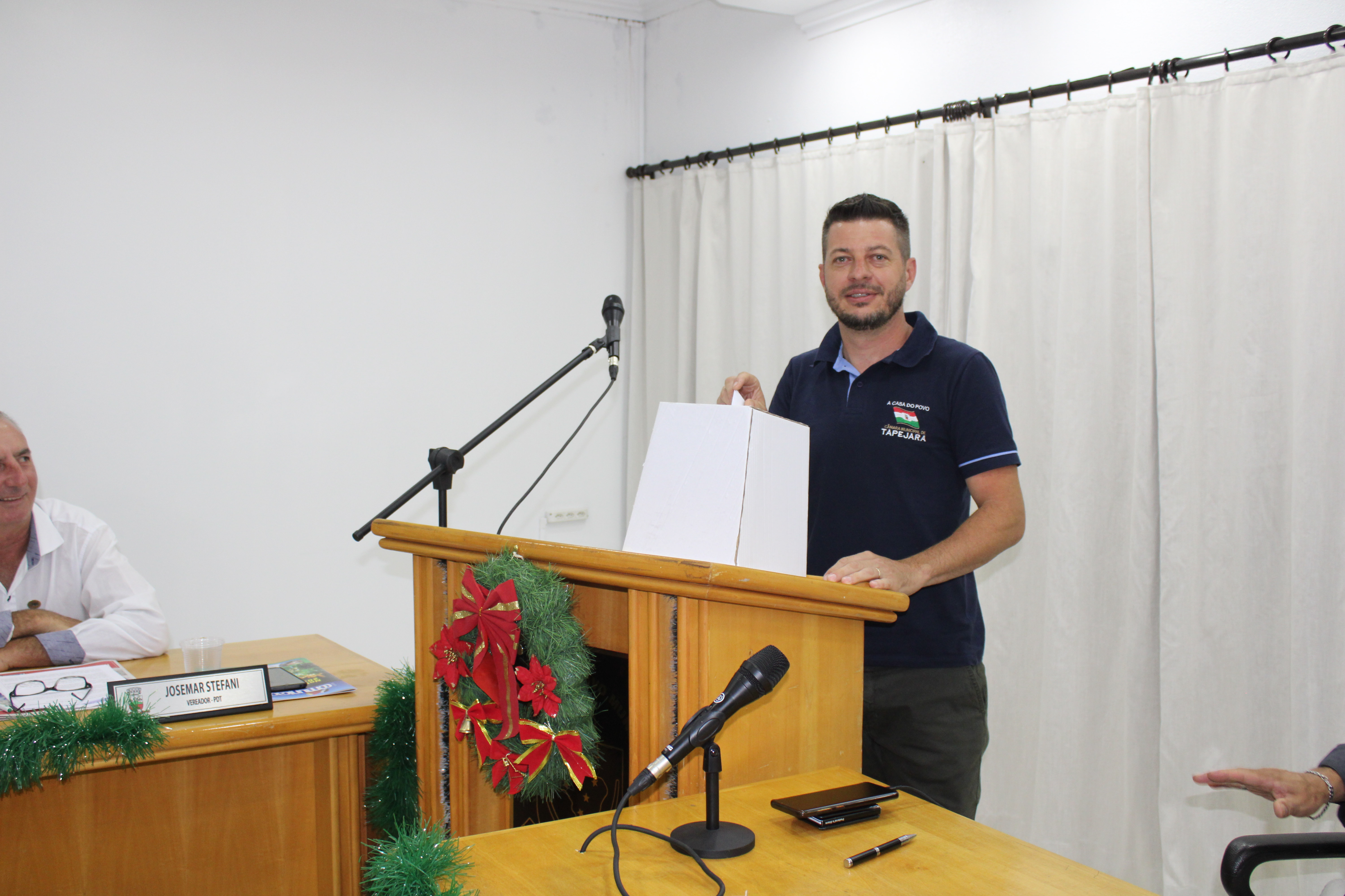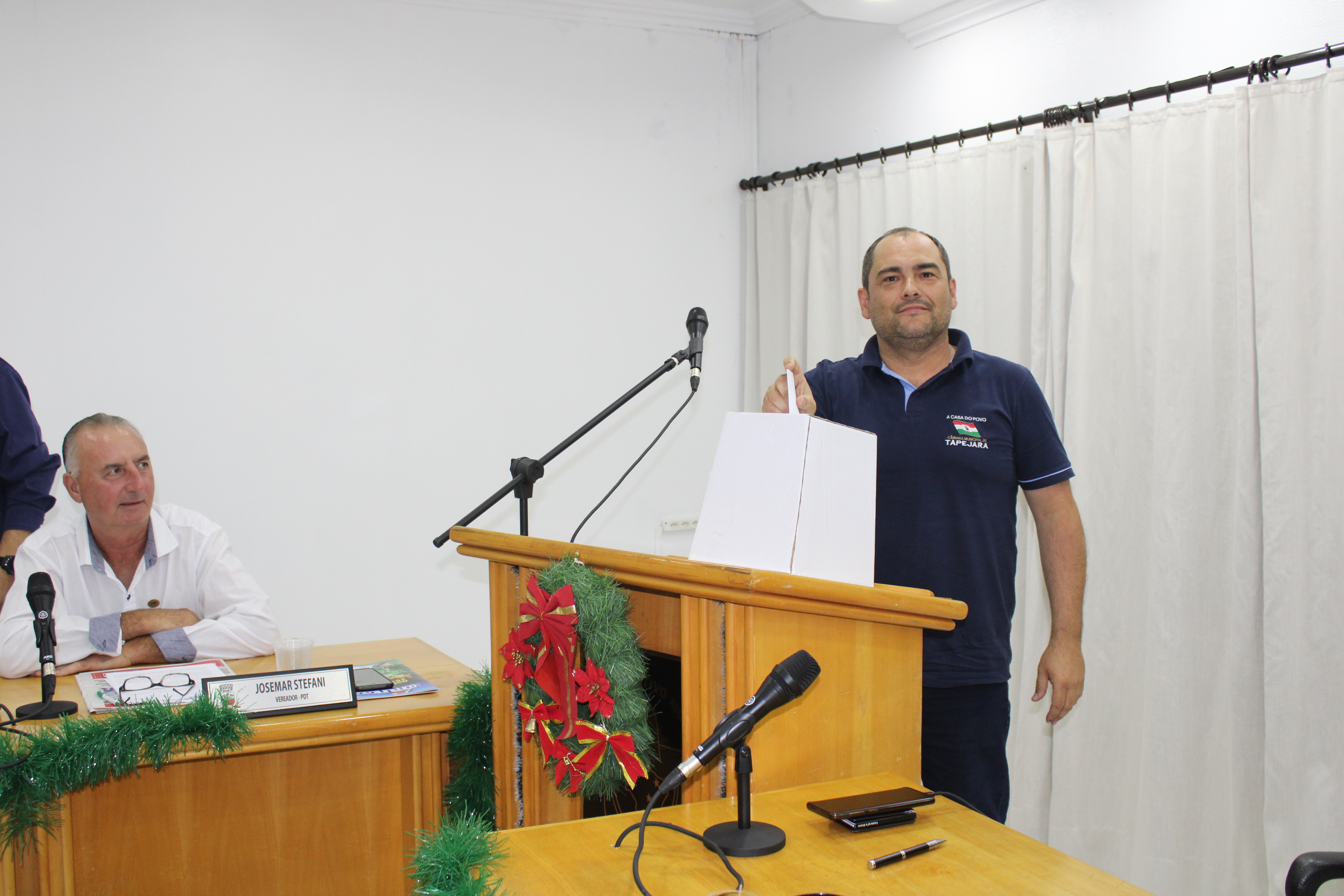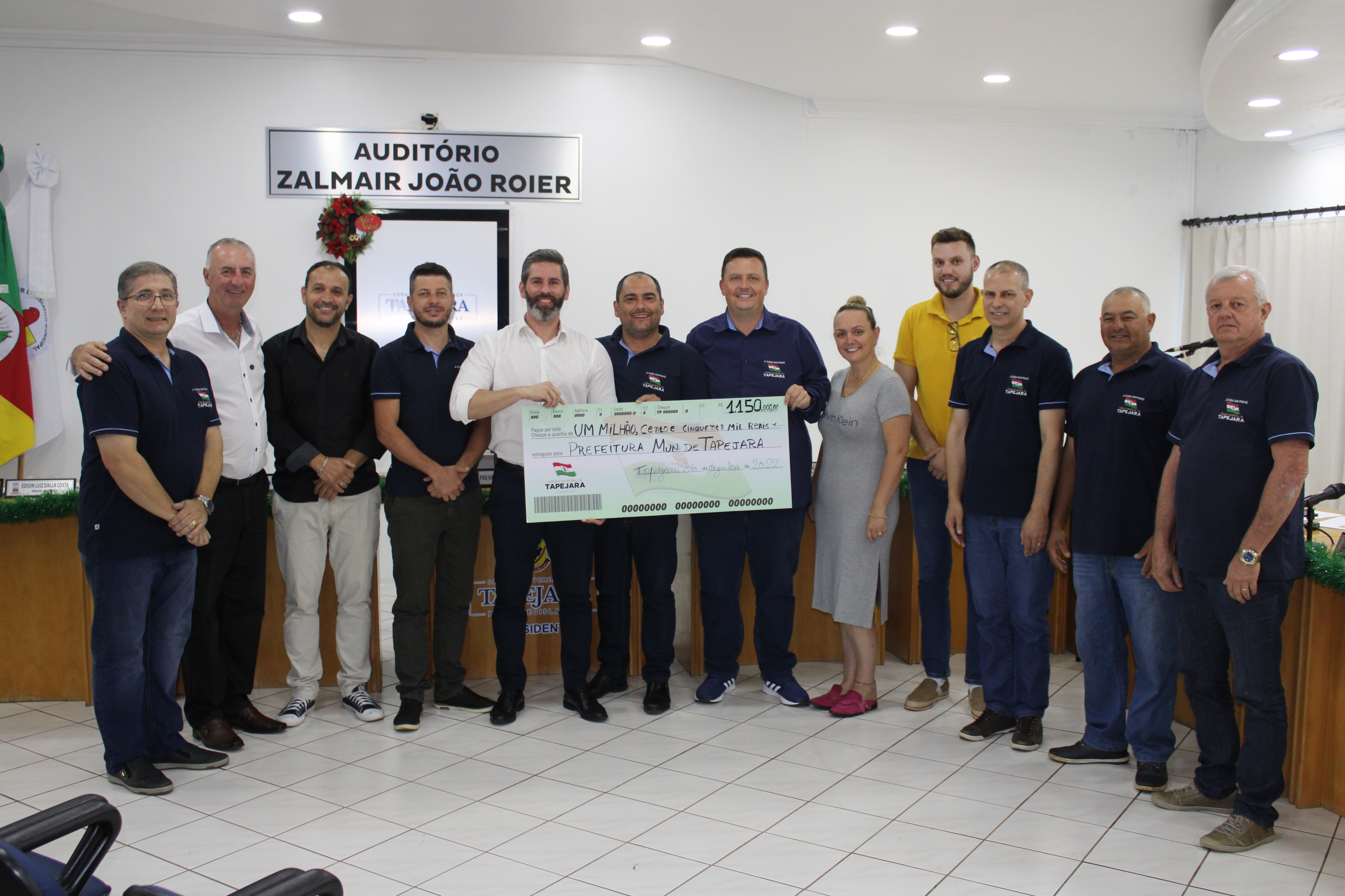 O Presidente Carlos Eduardo de Oliveira iniciou os trabalhos realizando a entrega simbólica do valor de R$ 1.150.000,00 (um milhão cento e cinquenta mil reais) provenientes da economia de gastos do Poder Legislativo até o mês de dezembro/2022, referente ao duodécimo, não utilizados. O procurador do município Leonardo Frigeri esteve representando o executivo neste ato. O repasse foi feito em duas etapas, sendo a primeira de R$ 600.000,00 (seiscentos mil reais) em meados deste ano para auxílio na implantação do sistema de vídeo monitoramento da cidade de Tapejara e agora mais a quantia de R$ 550.000,00 (quinhentos e cinquenta mil reais), que ainda estão disponíveis e em caixa do Poder Legislativo.