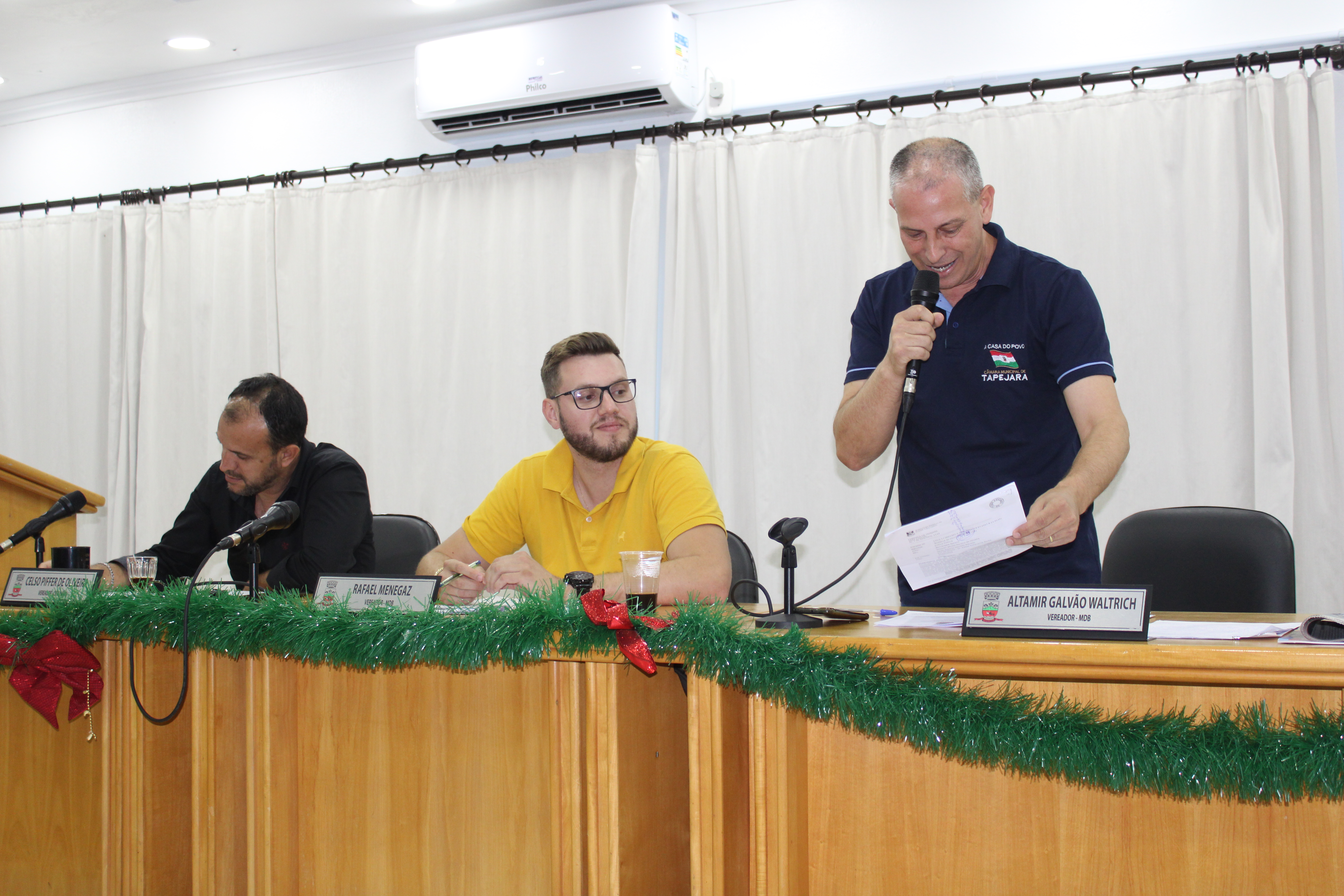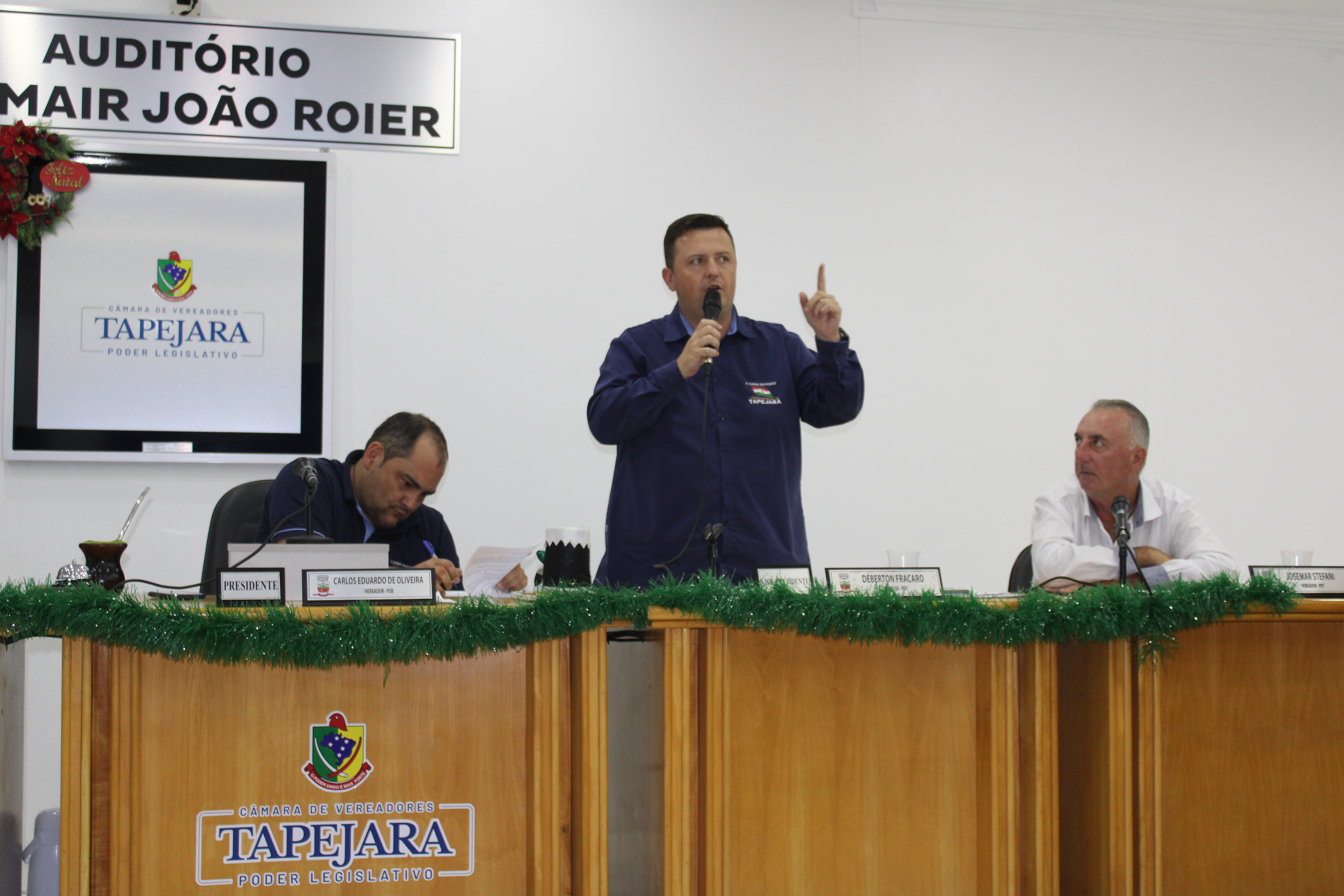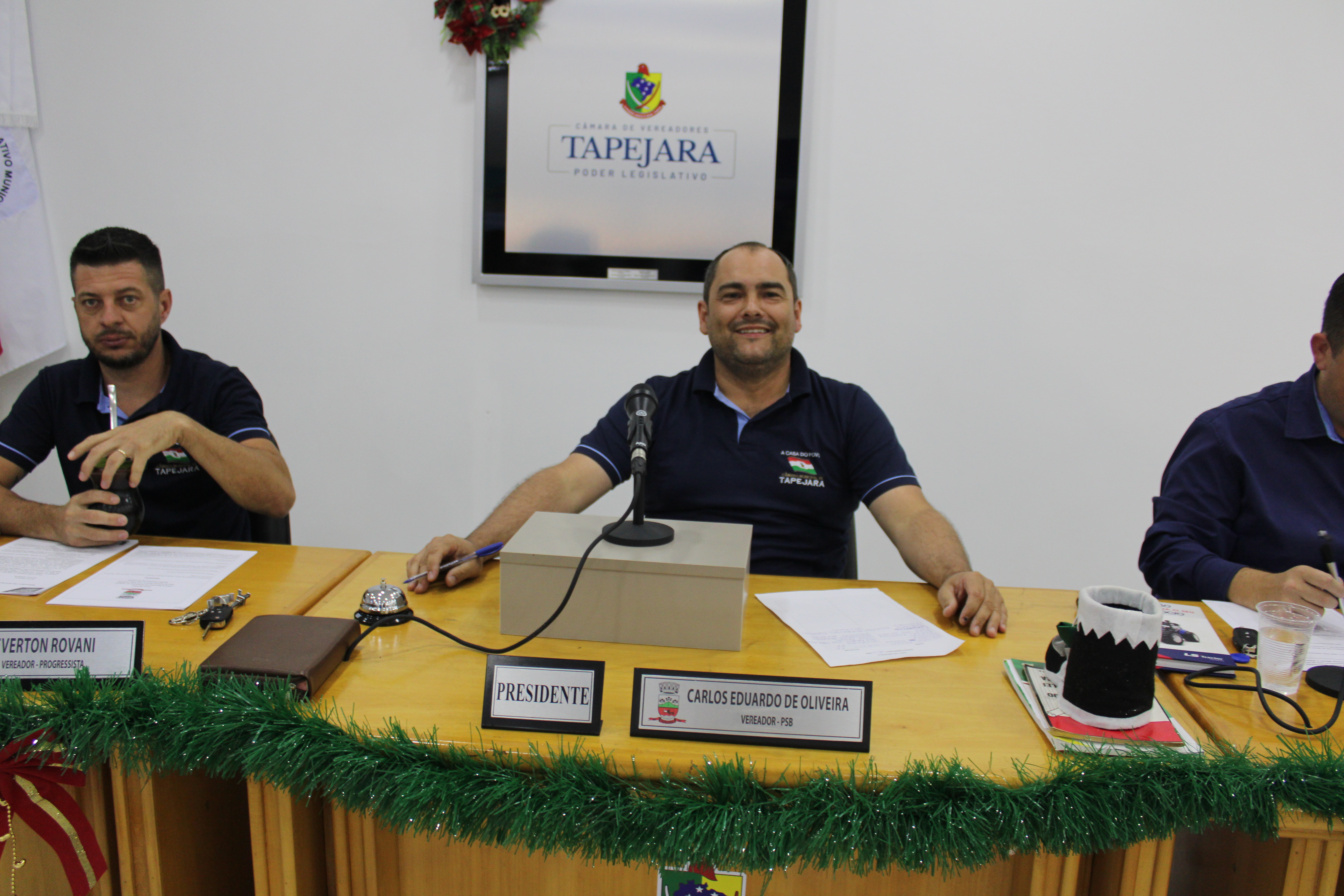 O Presidente Carlos Eduardo de Oliveira iniciou os trabalhos realizando a entrega simbólica do valor de R$ 1.150.000,00 (um milhão cento e cinquenta mil reais) provenientes da economia de gastos do Poder Legislativo até o mês de dezembro/2022, referente ao duodécimo, não utilizados. O procurador do município Leonardo Frigeri esteve representando o executivo neste ato. O repasse foi feito em duas etapas, sendo a primeira de R$ 600.000,00 (seiscentos mil reais) em meados deste ano para auxílio na implantação do sistema de vídeo monitoramento da cidade de Tapejara e agora mais a quantia de R$ 550.000,00 (quinhentos e cinquenta mil reais), que ainda estão disponíveis e em caixa do Poder Legislativo.