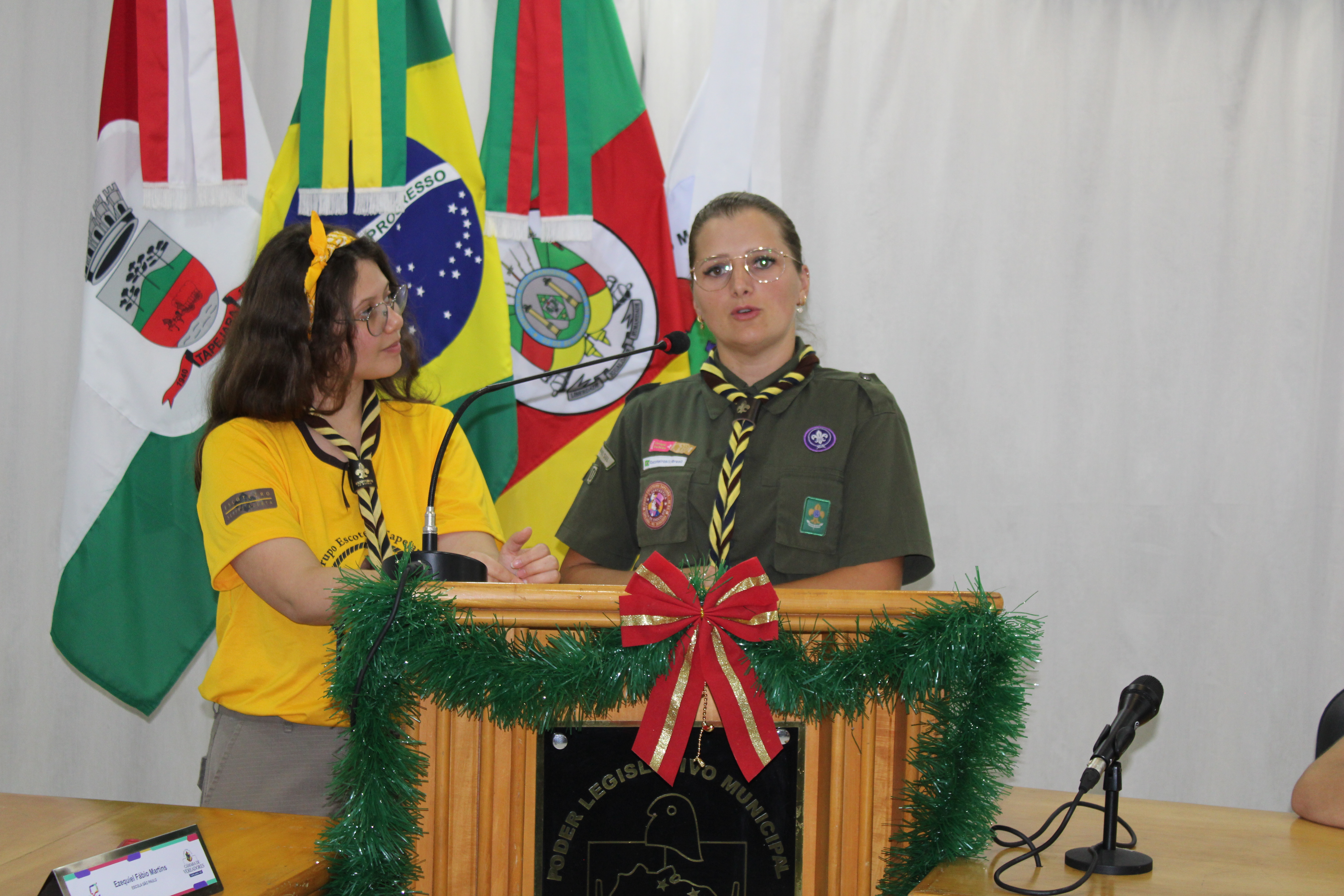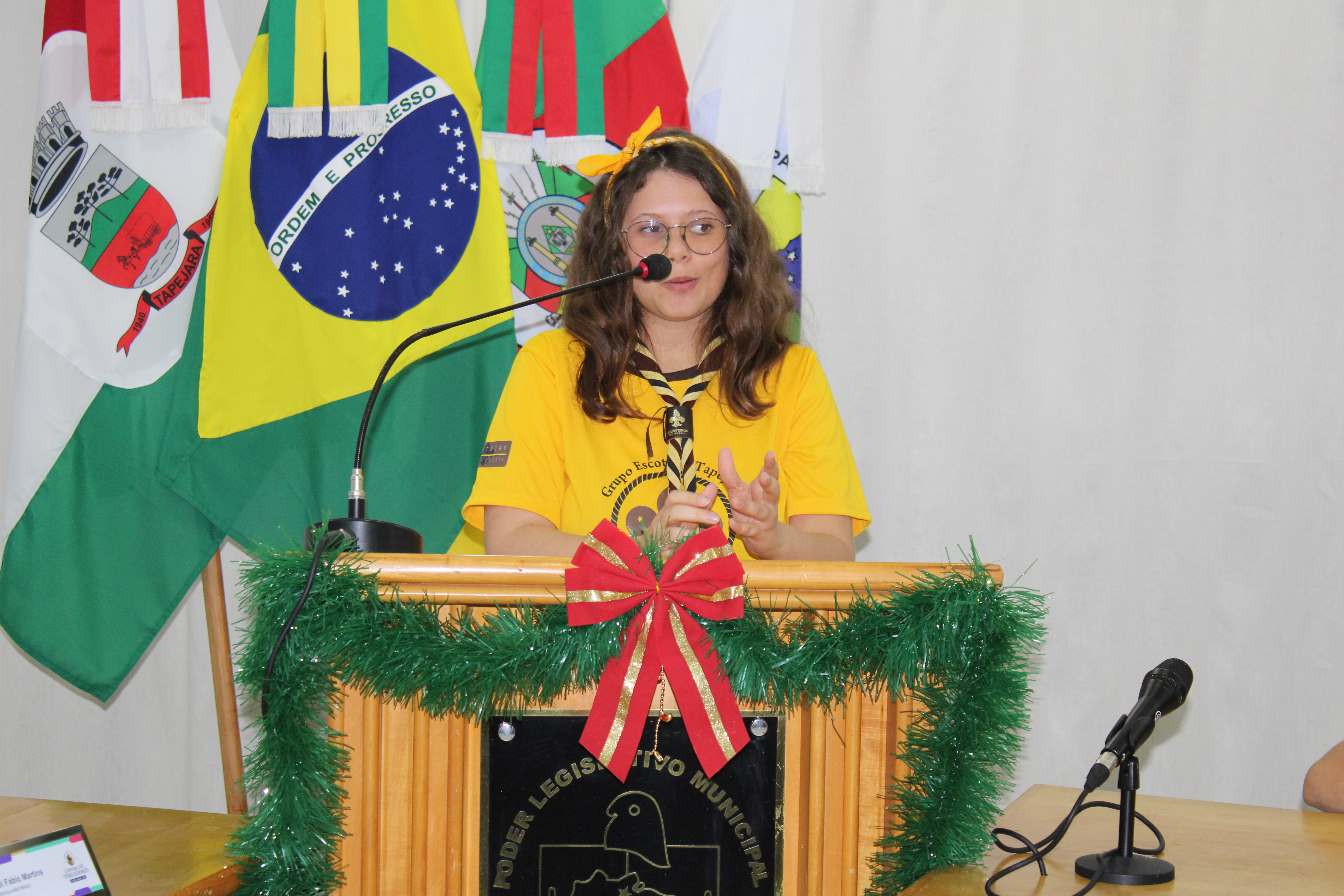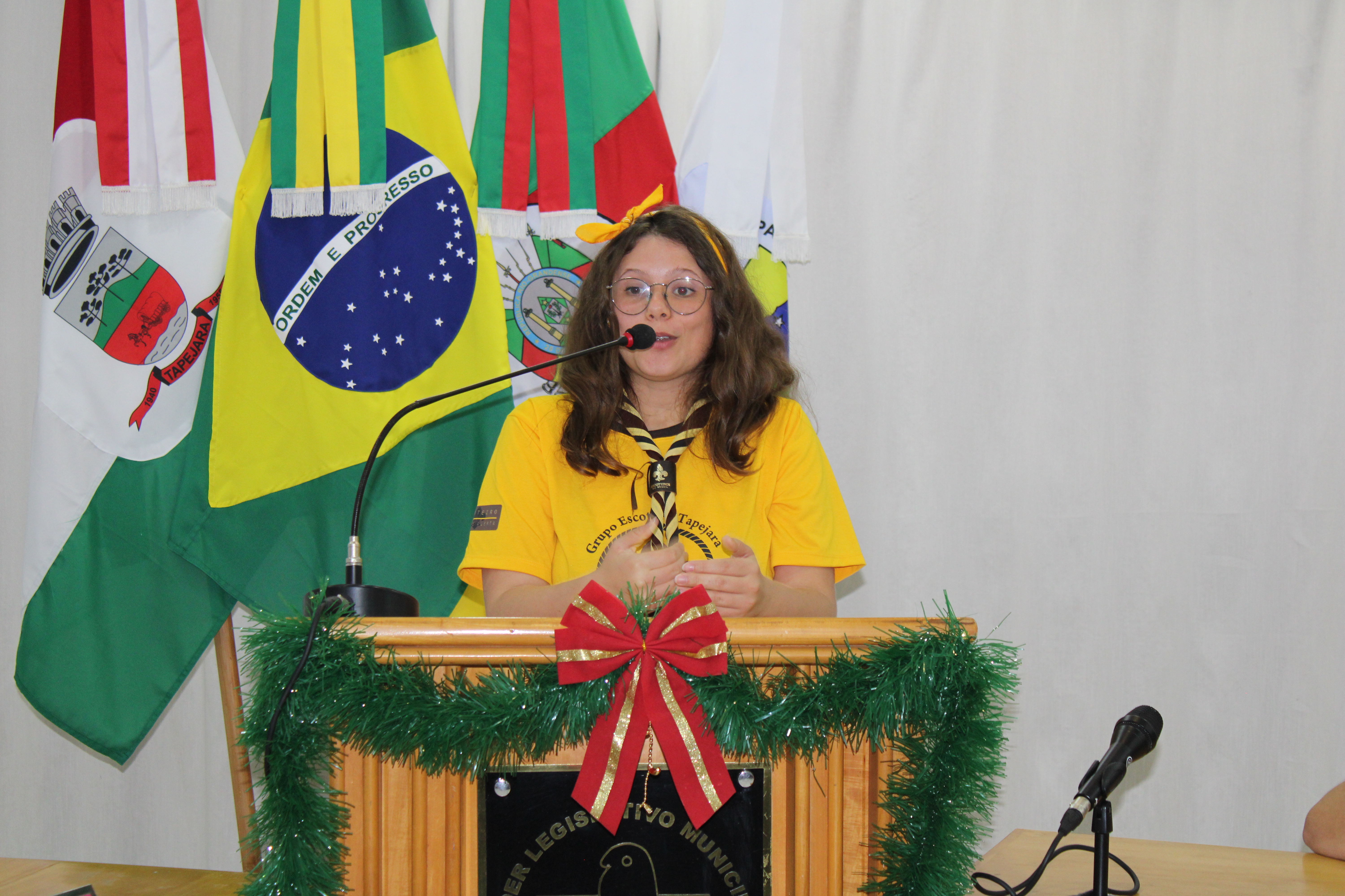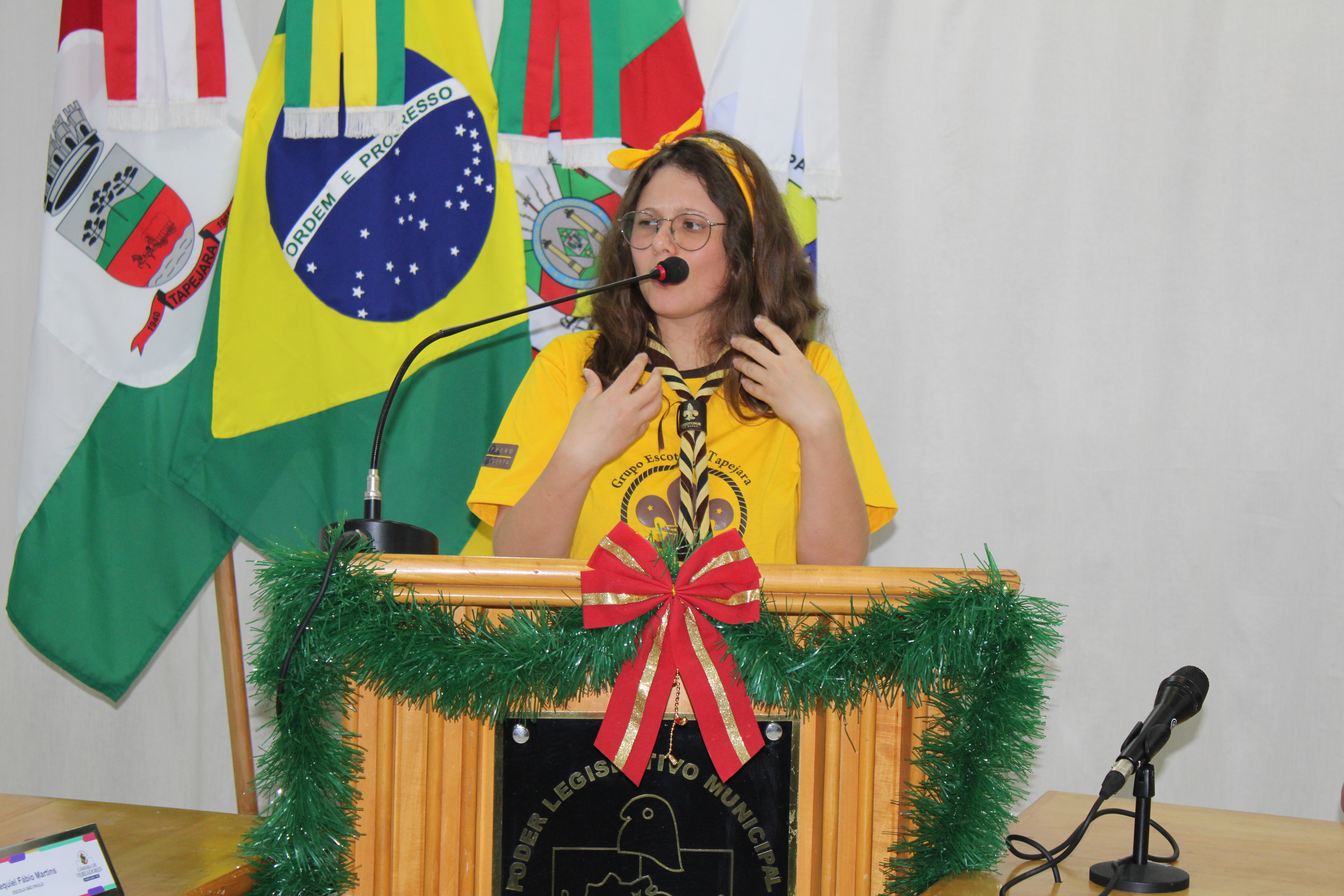 Com fundamento no art. 43 do Regimento Interno Mirim, foi convidada a Sra. Letícia Agnes Bruch, Representante dos Escoteiros de Tapejara para utilizar da tribuna e fazer uma explanação sobre o Movimento e em especial ao Grupo Escoteiro Tapejara. Na oportunidade os Verreadores Mirins puderam fazer muitas perguntas e esclarecer várias dúvidas e curiosidades que tinham sobre o assunto.