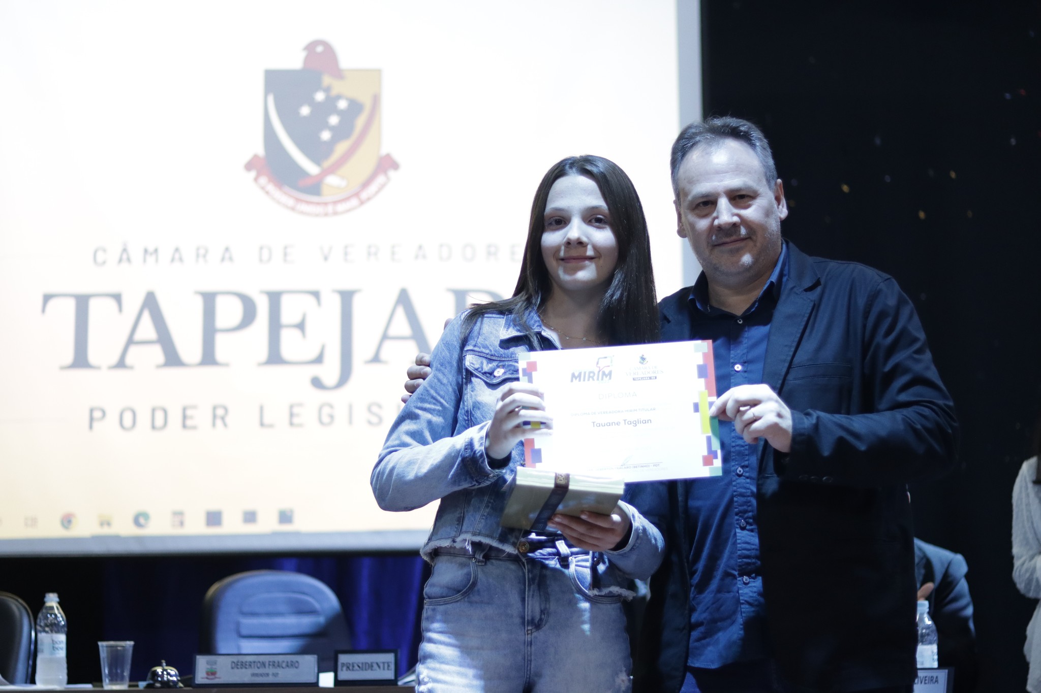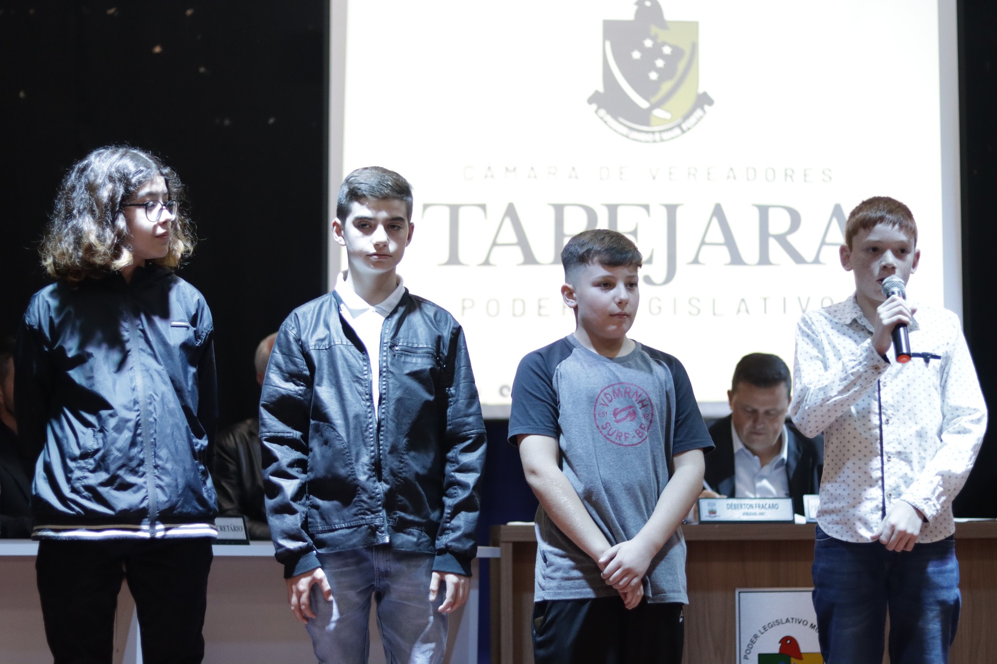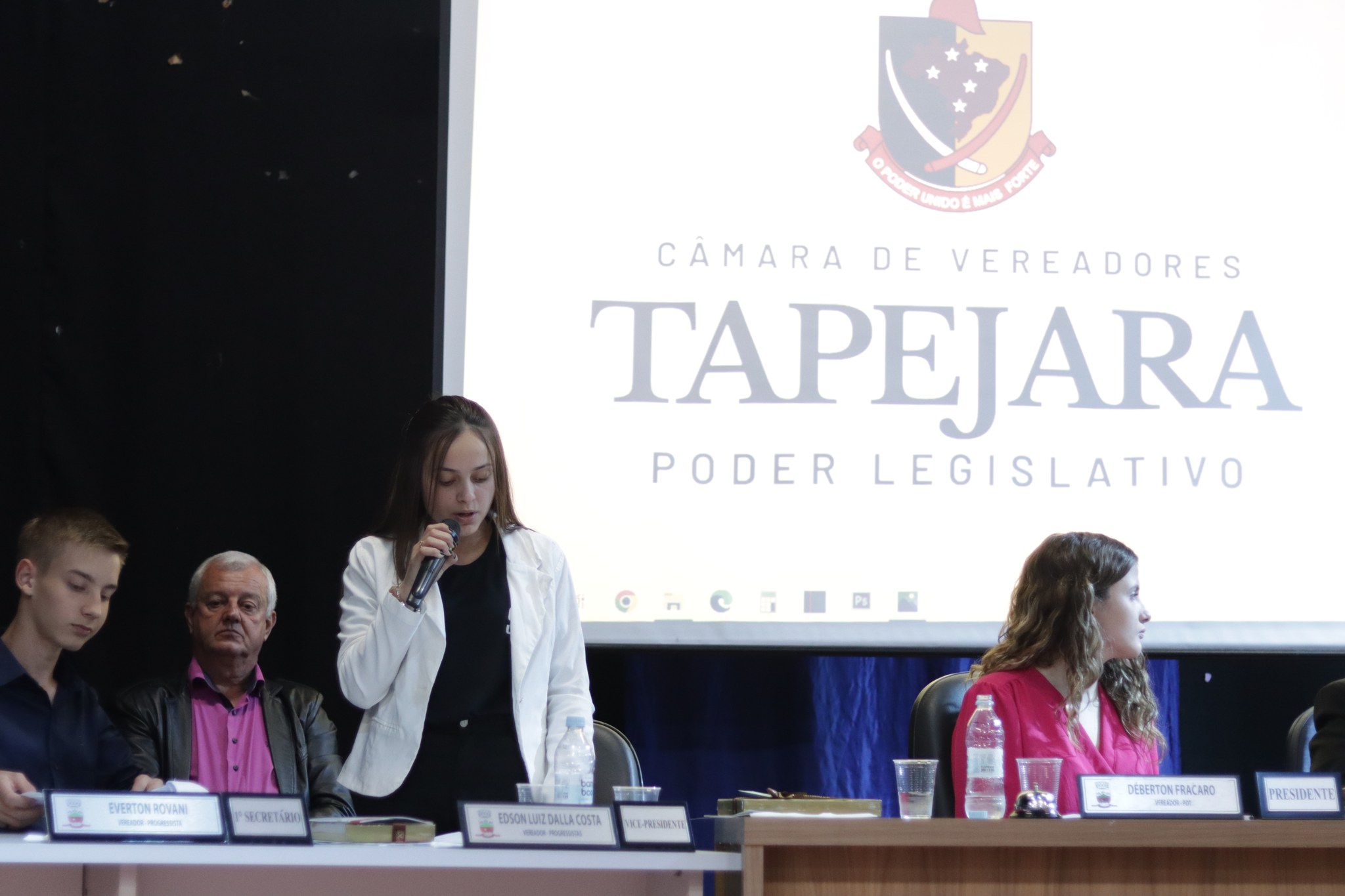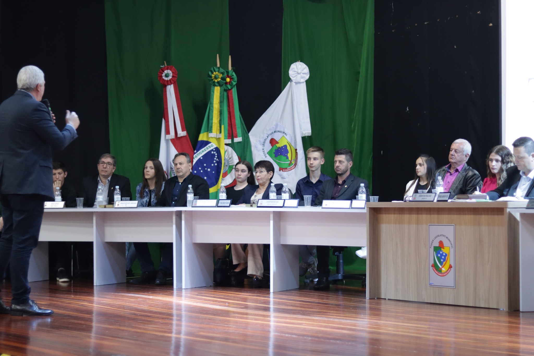 O Presidente do Legislativo Déberton Fracaro (Betinho) conduziu os trabalhos e fez a leitura do compromisso, aonde juntamente com os demais Vereadores e contando com a participação do Prefeito Evanir Wolf, Vice Prefeito Rodinei Bruel e a Coordenadora Elaine Hannel, que esteve representando a Coordenadora Geral da Educação Jaqueline Palma, estiveram entregando os Diplomas aos Vereadores Mirins e Suplentes e os Certificados para as Escolas participantes.