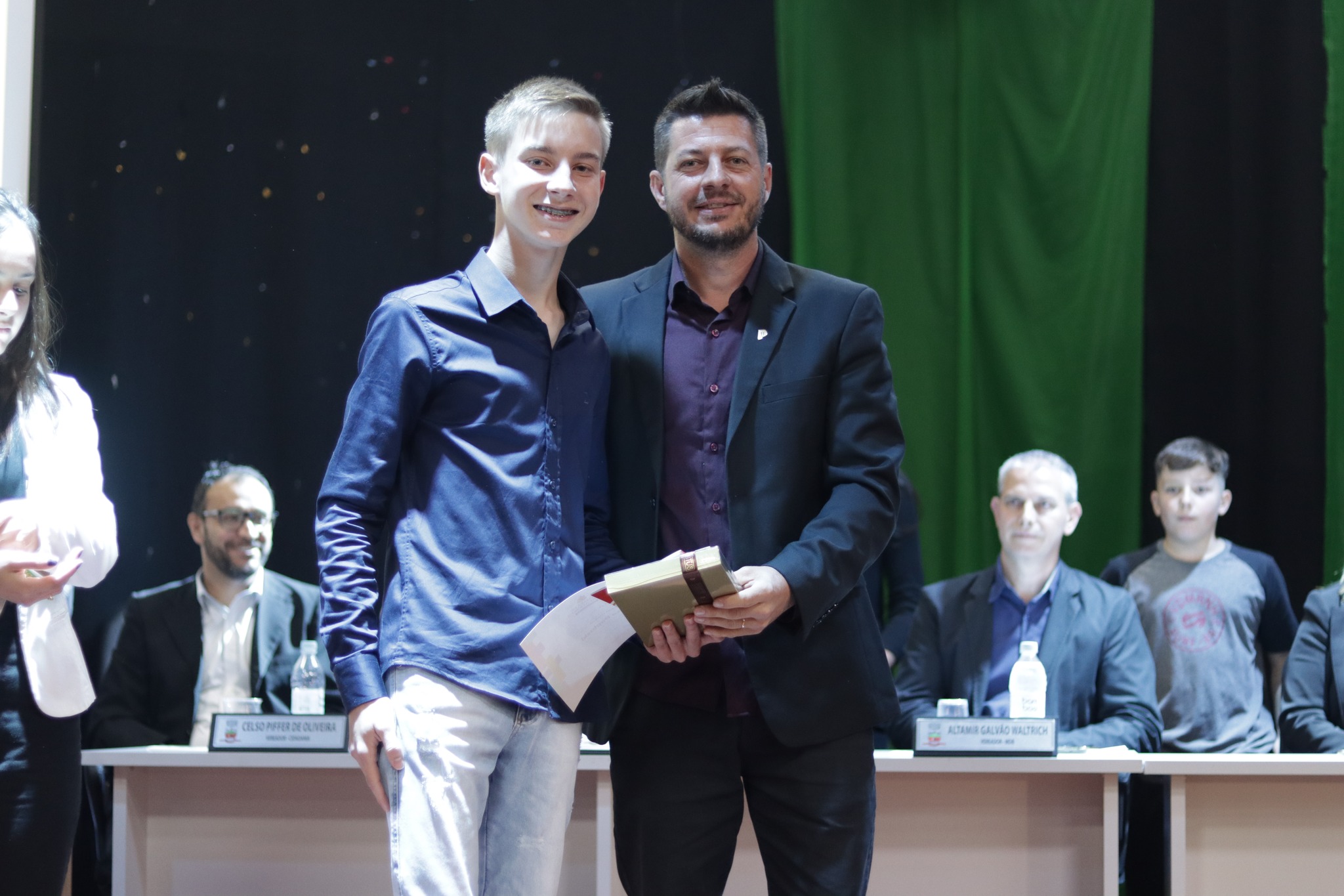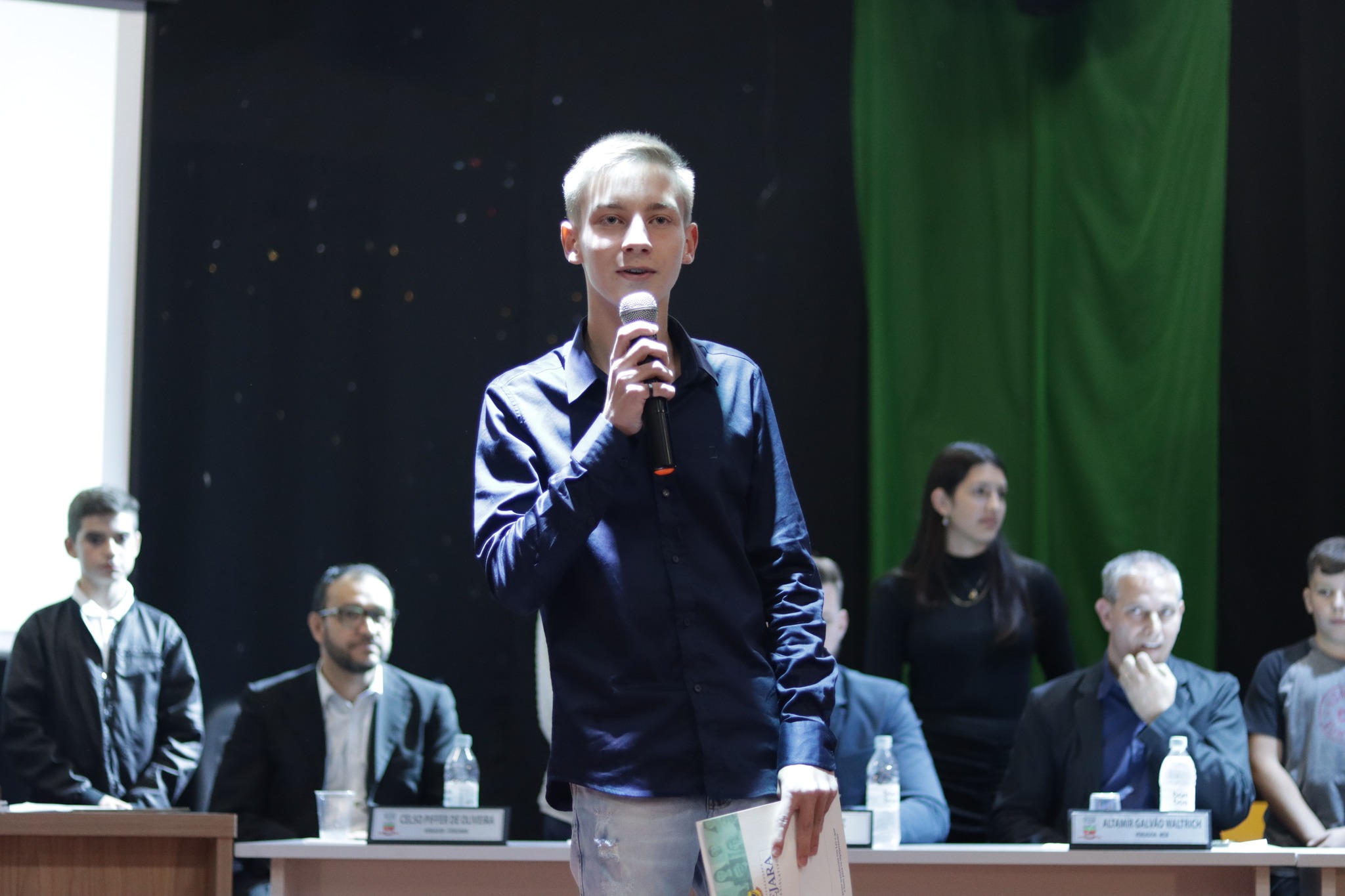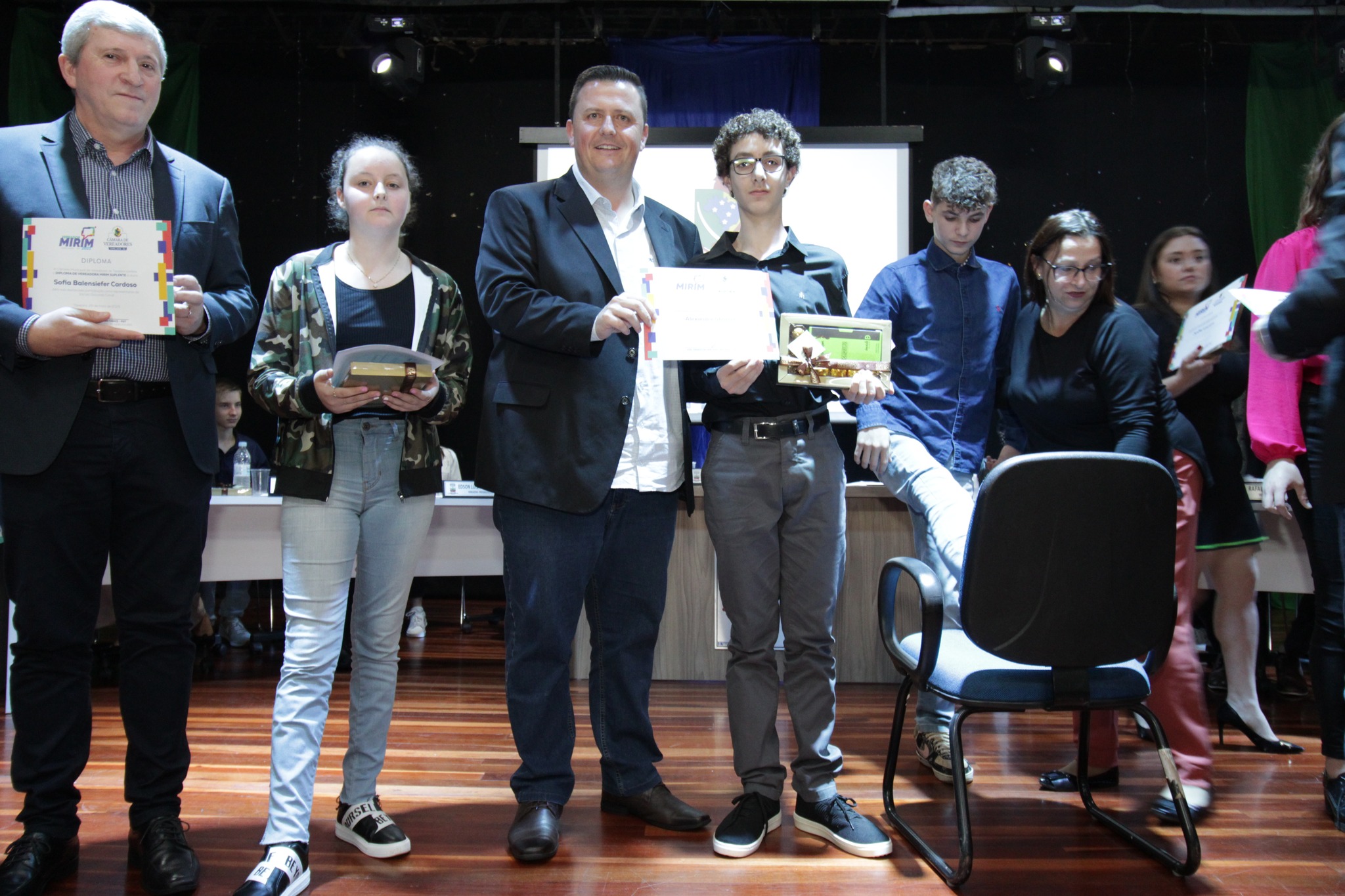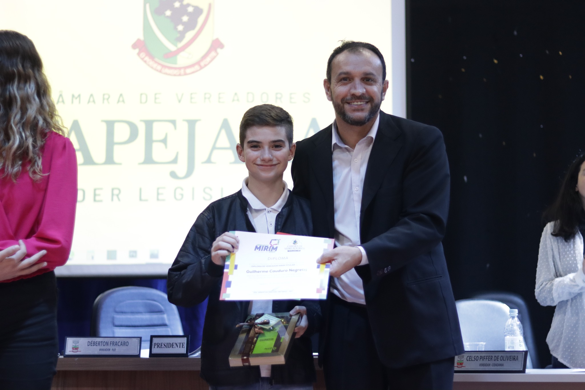 O Presidente do Legislativo Déberton Fracaro (Betinho) conduziu os trabalhos e fez a leitura do compromisso, aonde juntamente com os demais Vereadores e contando com a participação do Prefeito Evanir Wolf, Vice Prefeito Rodinei Bruel e a Coordenadora Elaine Hannel, que esteve representando a Coordenadora Geral da Educação Jaqueline Palma, estiveram entregando os Diplomas aos Vereadores Mirins e Suplentes e os Certificados para as Escolas participantes.