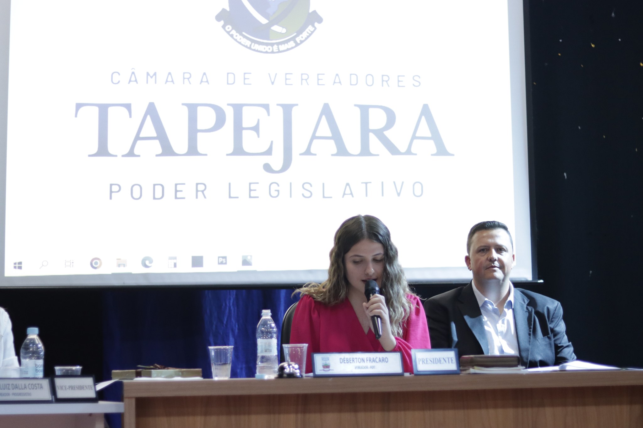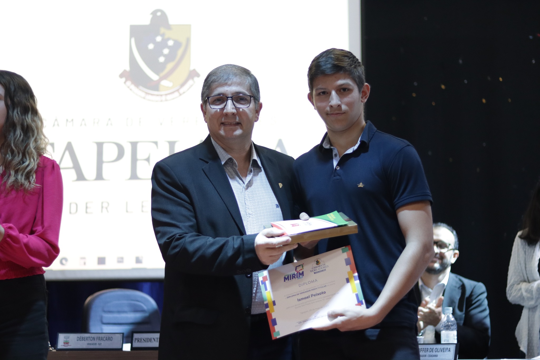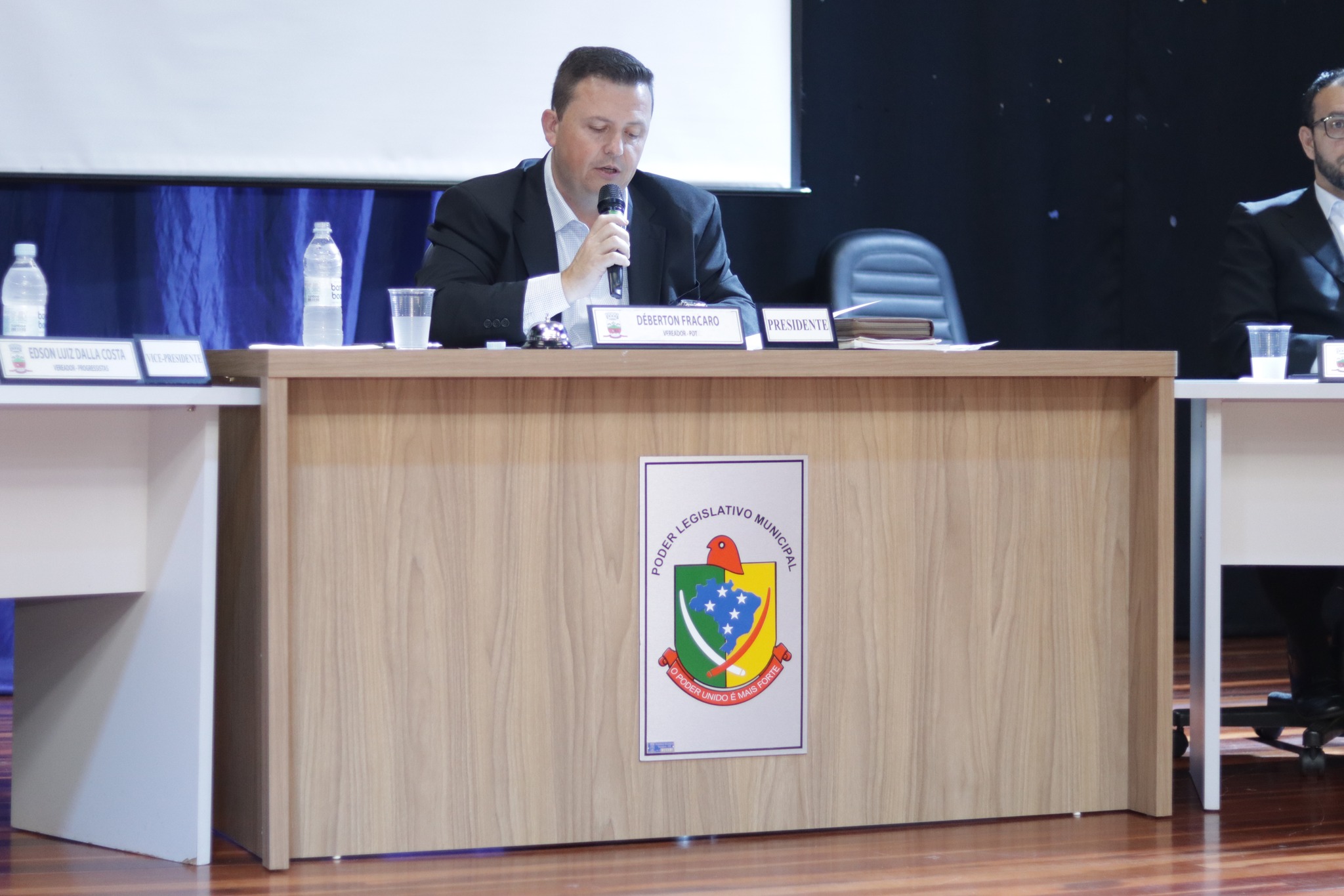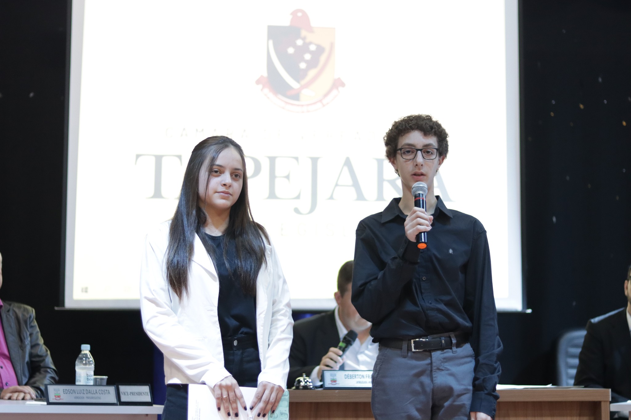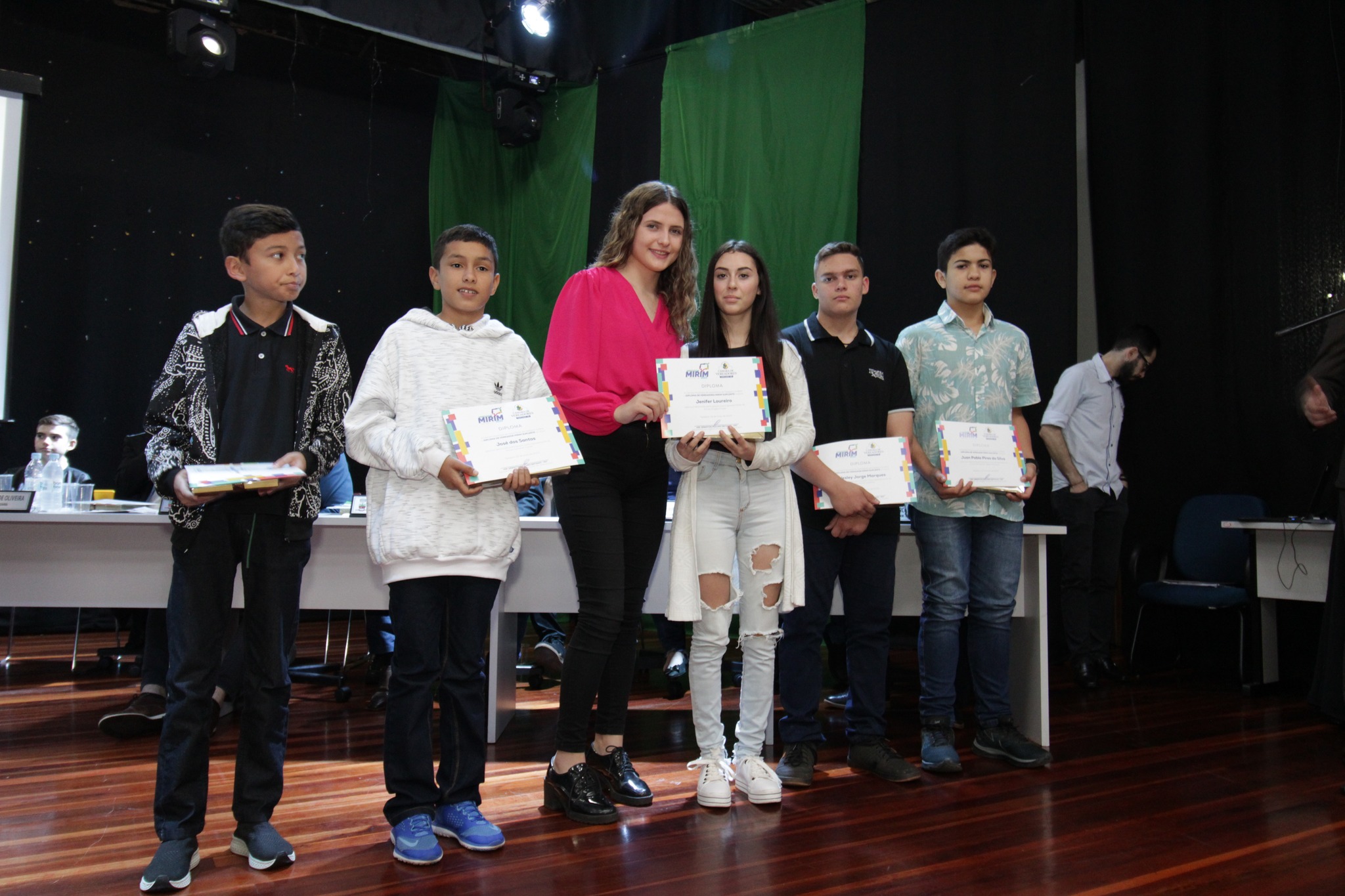 O Presidente do Legislativo Déberton Fracaro (Betinho) conduziu os trabalhos e fez a leitura do compromisso, aonde juntamente com os demais Vereadores e contando com a participação do Prefeito Evanir Wolf, Vice Prefeito Rodinei Bruel e a Coordenadora Elaine Hannel, que esteve representando a Coordenadora Geral da Educação Jaqueline Palma, estiveram entregando os Diplomas aos Vereadores Mirins e Suplentes e os Certificados para as Escolas participantes.