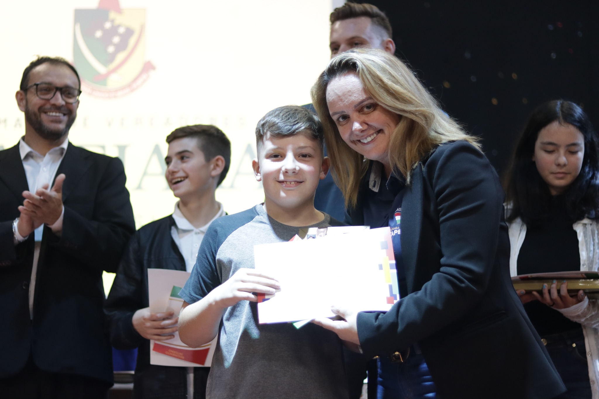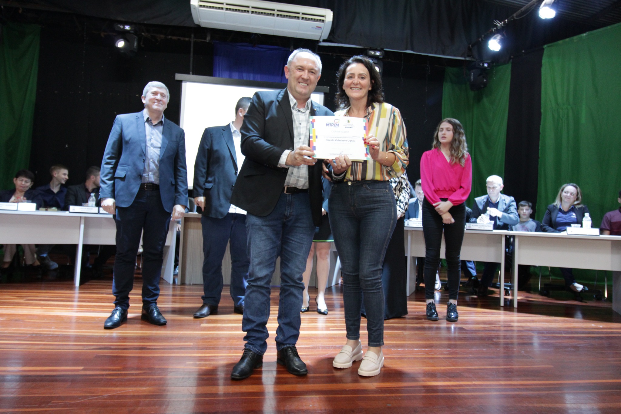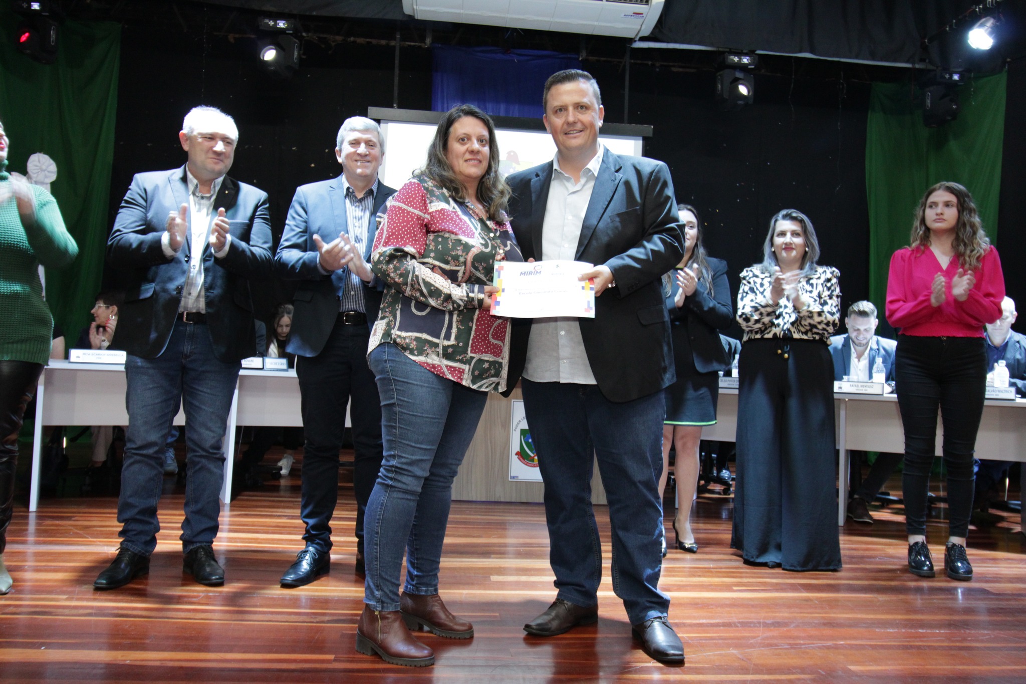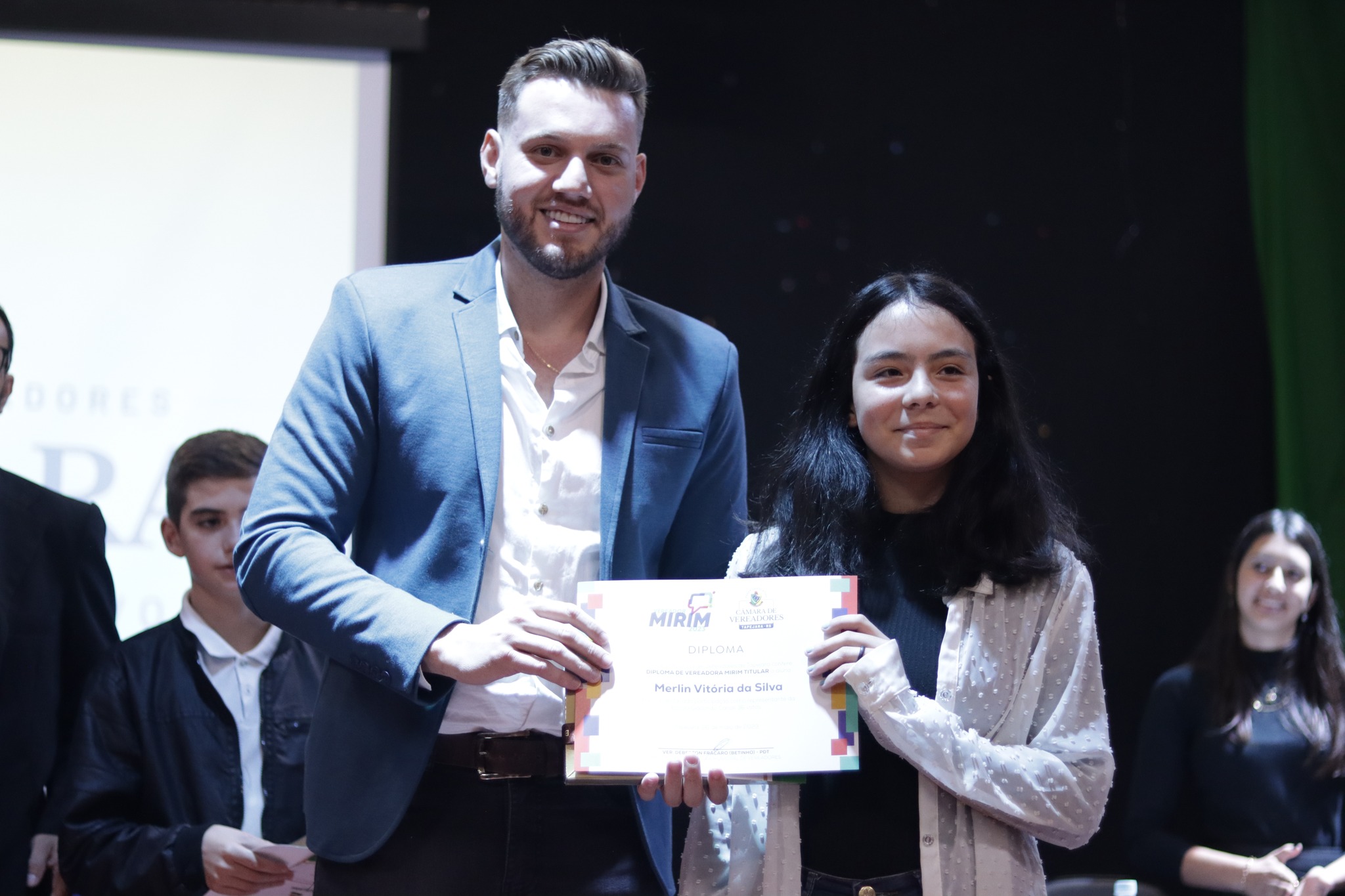 O Presidente do Legislativo Déberton Fracaro (Betinho) conduziu os trabalhos e fez a leitura do compromisso, aonde juntamente com os demais Vereadores e contando com a participação do Prefeito Evanir Wolf, Vice Prefeito Rodinei Bruel e a Coordenadora Elaine Hannel, que esteve representando a Coordenadora Geral da Educação Jaqueline Palma, estiveram entregando os Diplomas aos Vereadores Mirins e Suplentes e os Certificados para as Escolas participantes.