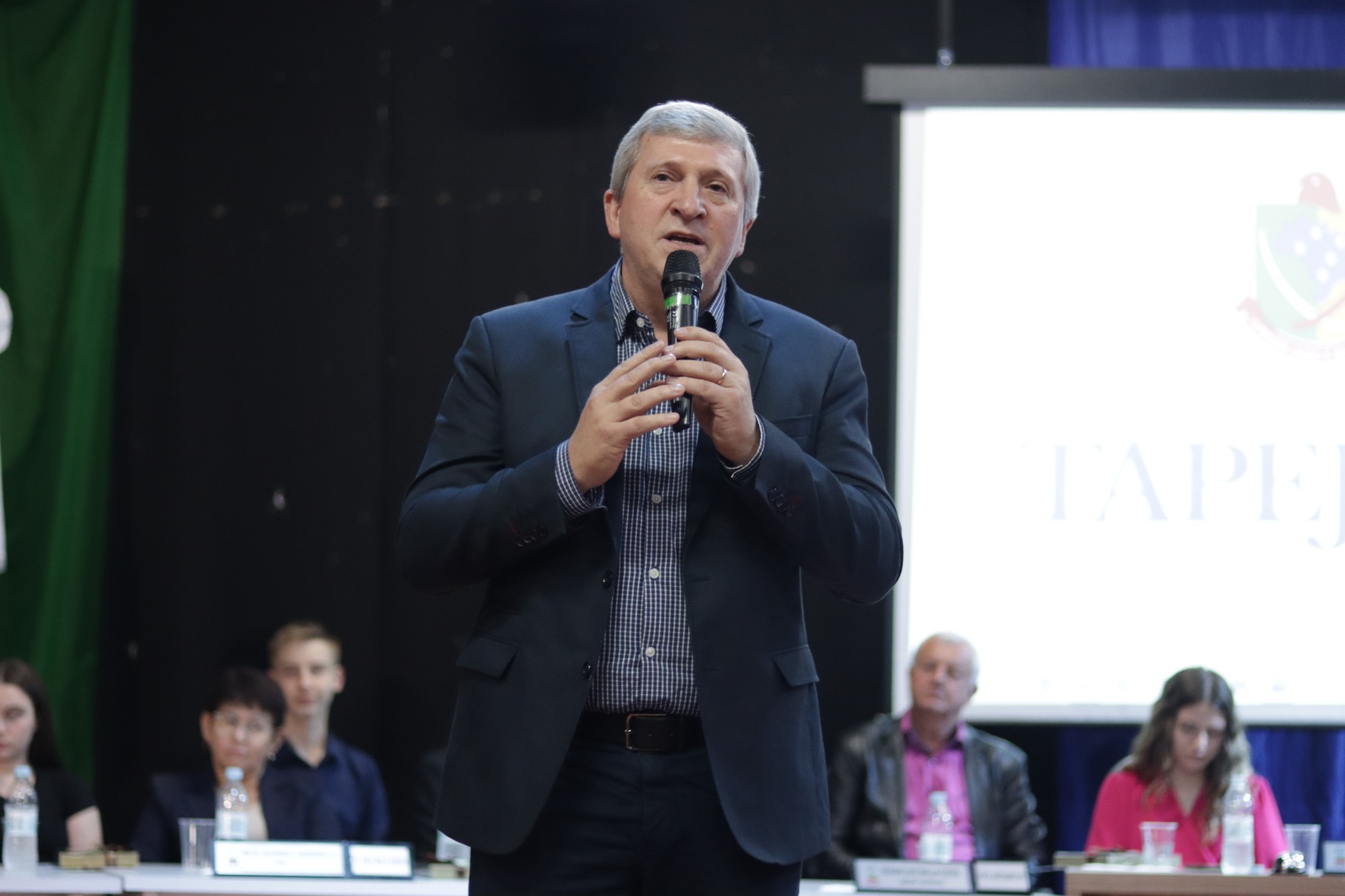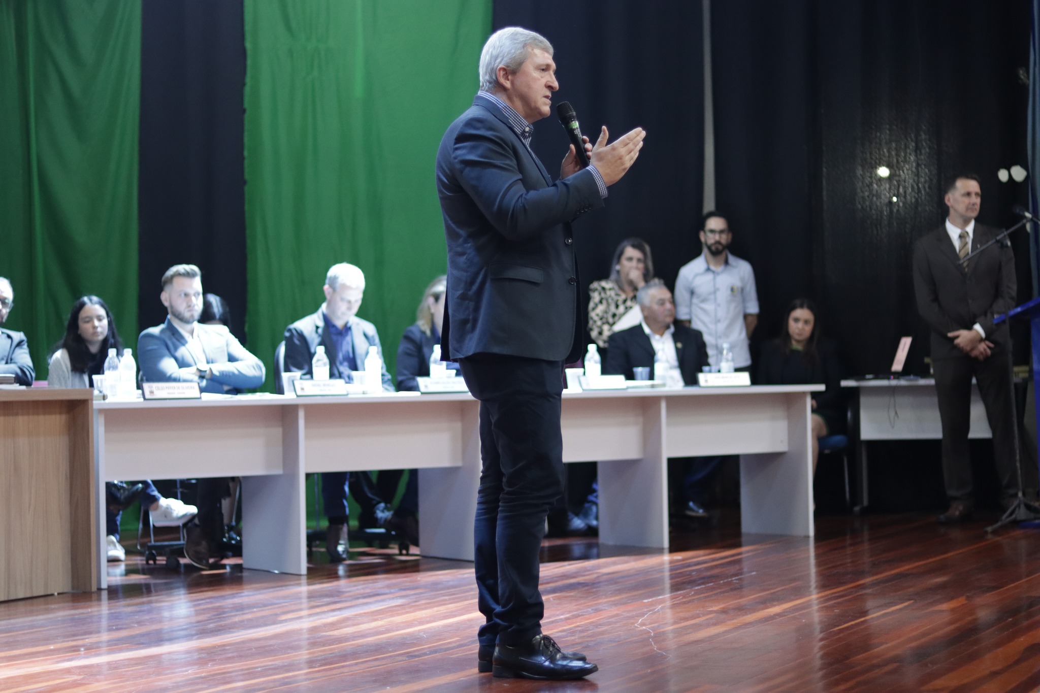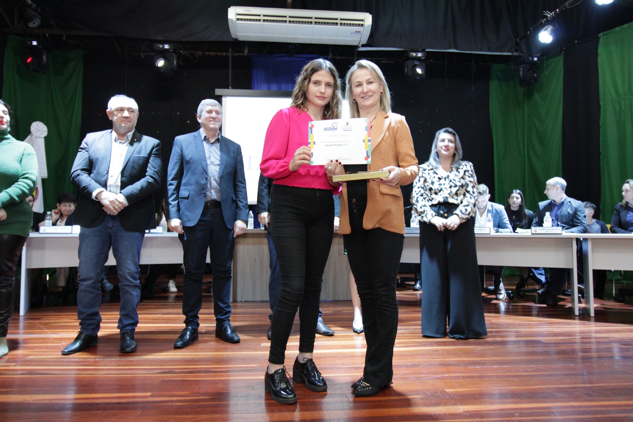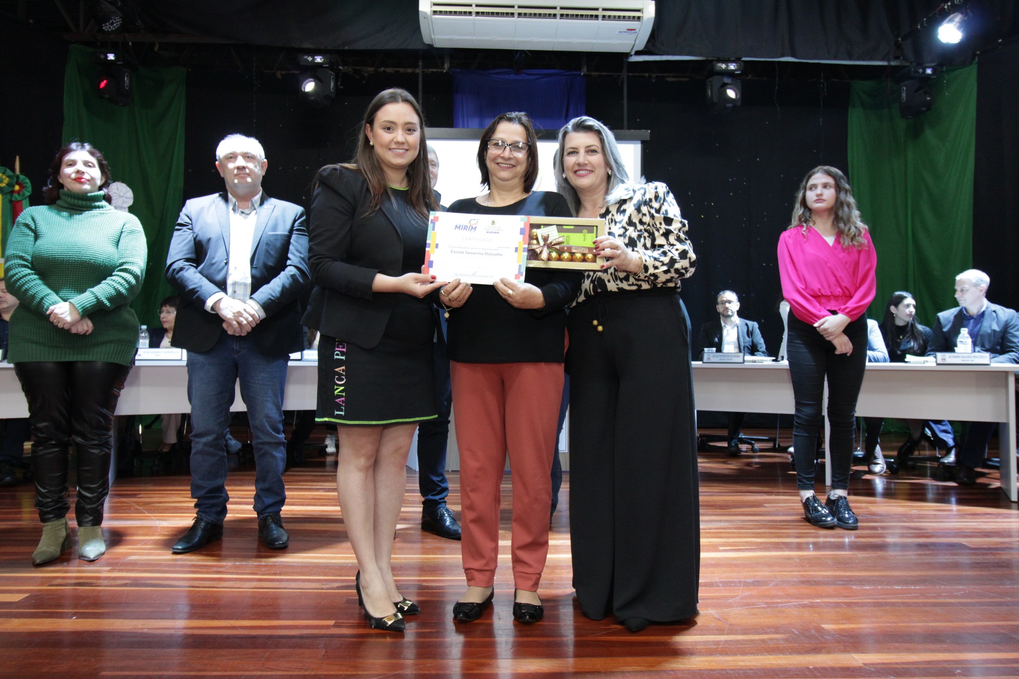 O Presidente do Legislativo Déberton Fracaro (Betinho) conduziu os trabalhos e fez a leitura do compromisso, aonde juntamente com os demais Vereadores e contando com a participação do Prefeito Evanir Wolf, Vice Prefeito Rodinei Bruel e a Coordenadora Elaine Hannel, que esteve representando a Coordenadora Geral da Educação Jaqueline Palma, estiveram entregando os Diplomas aos Vereadores Mirins e Suplentes e os Certificados para as Escolas participantes.