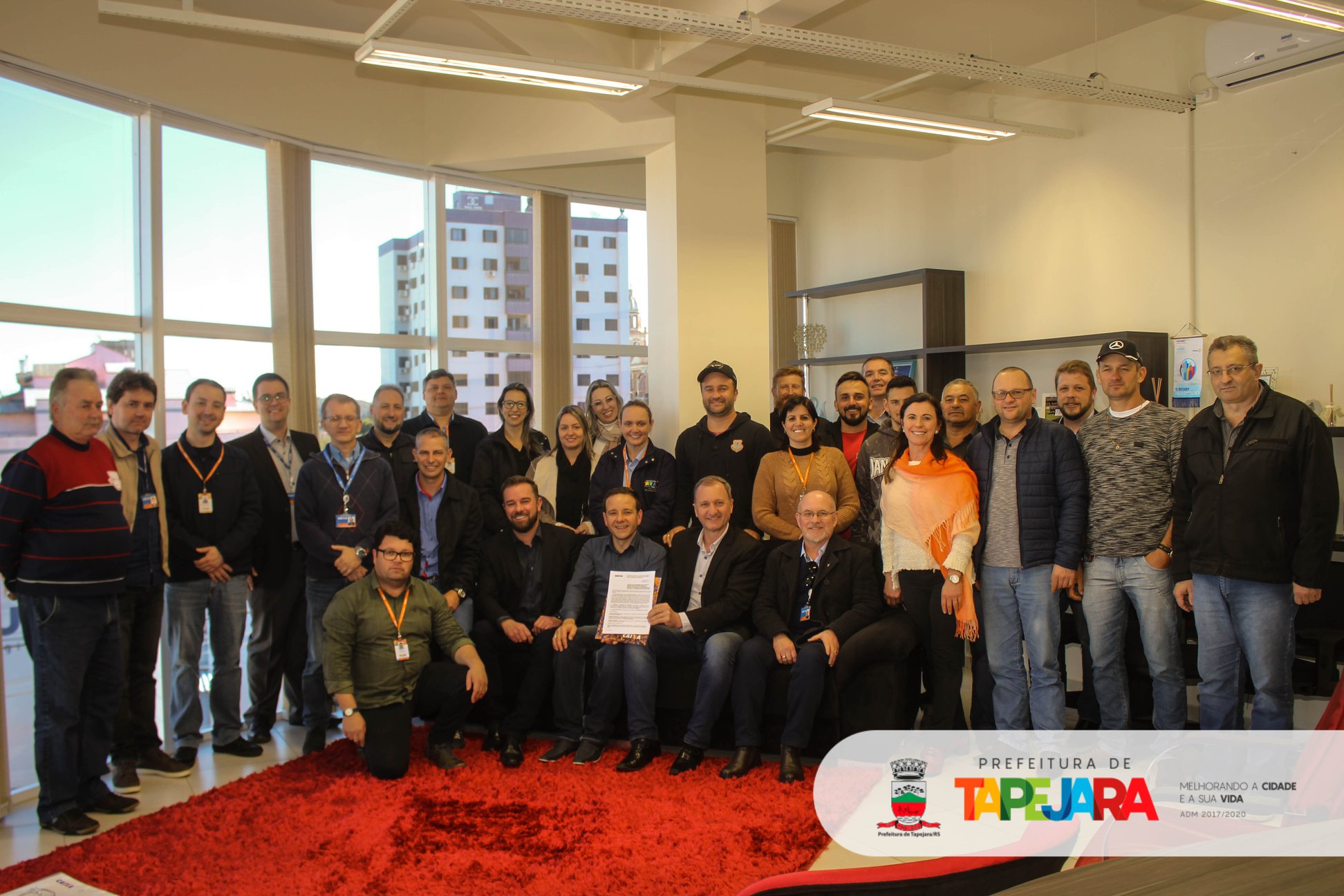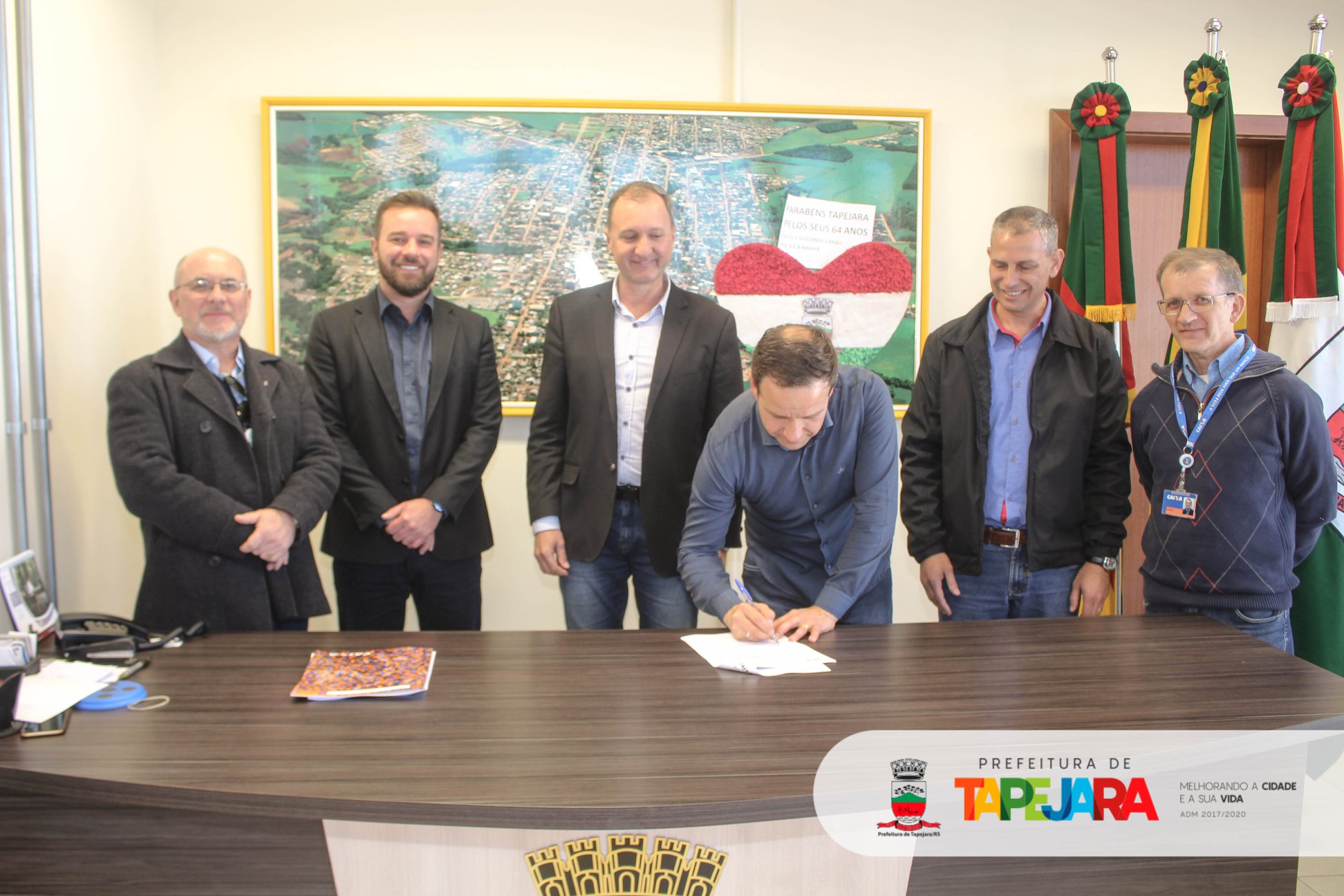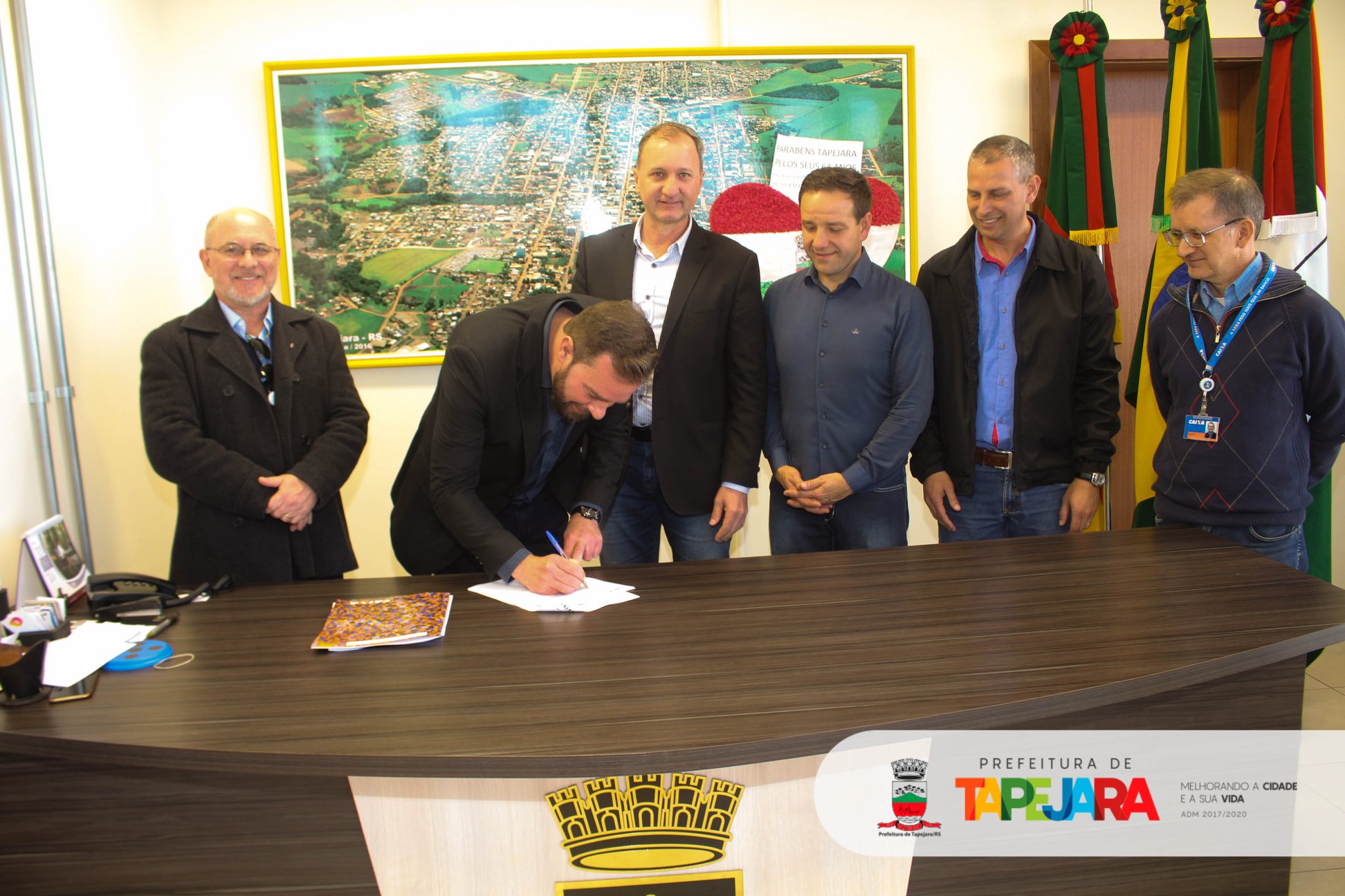 Também estiveram participando da assinatura: vice-prefeito e secretário de Serviços Urbanos, Marcos Davi Bacega; chefe de Gabinete, Edmilson José Piton; secretária da Saúde, Maeli Caroline Brunetto Cerezolli; secretário de Educação, Desporto e Cultura, Adenilso Aimi; secretário da Fazenda, Antônio Carlos Borela; secretário do Desenvolvimento Industrial e Comercial, Marcos Bressan; secretária de Assistência Social, Ilmara Pagno Sebben; gerente da Gigov, Carlos Pizarro; engenheiro da Gigov, Mateus Pieresan; analista da Gigov, Everton dos Santos; gerente geral da Agência da Caixa, Nivaldo Bentak; gerente da Agência Caixa Tapejara, Tiago Strasburgue; coordenadores, servidores e representantes de entidades.