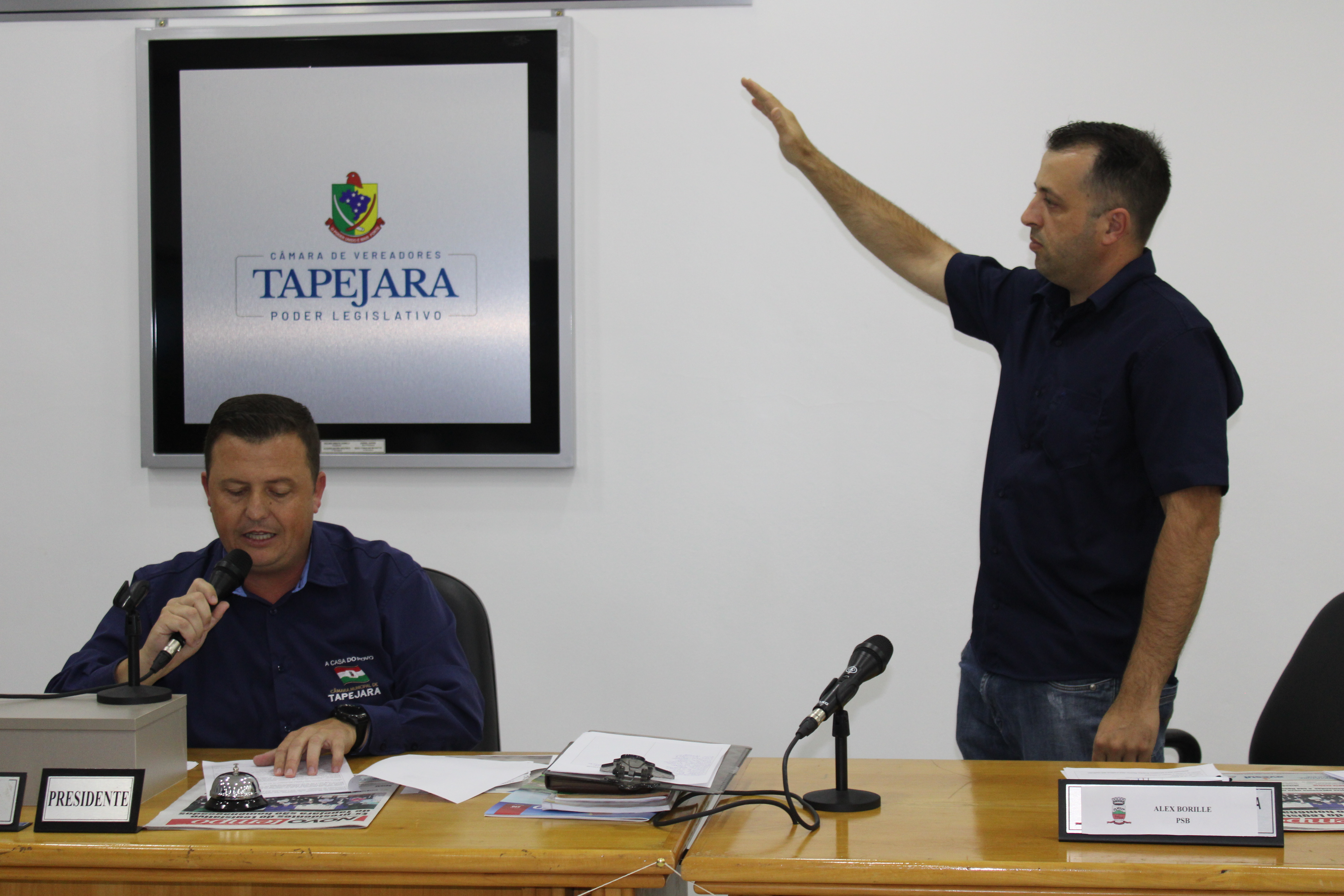 Ao iniciar a Sessão ordinária o Presidente Déberton Fracaro informou para fins de registro, que em 28 de novembro o Vereador e Presidente Carlos Eduardo de Oliveira, do PSB, assumiu o cargo de Prefeito em Exercício do município de Tapejara, tendo portanto se afastado de suas funções, pelo período de 04 dias, a iniciar-se no dia 28 de novembro. Pela forma regimental do artigo 45, então passou a assumir a função e as prerrogativas da Presidência desta casa, conforme ATA DE TRANSMISSÃO DE POSSE Nº 2446/2022. Na forma do artigo 30, do Regimento Interno, fez-se a necessidade nomear substituto no Cargo de Vereador da Bancada do partido PSB, sendo que, foi providenciada a convocação do suplente, porém, a 1ª Suplente Rita Assunta Scariot Sossela, o 2º suplente Eduardo Bortolotto, e o 3º Matheus de Paula, apresentaram justificativas justas não podendo assumir, tendo todos os pedidos deferidos pela Mesa Diretora, passando-se a convocar o 4º Suplente da Bancada do PSB, Sr. Alex Borille Loss, ao qual foi dado posse.