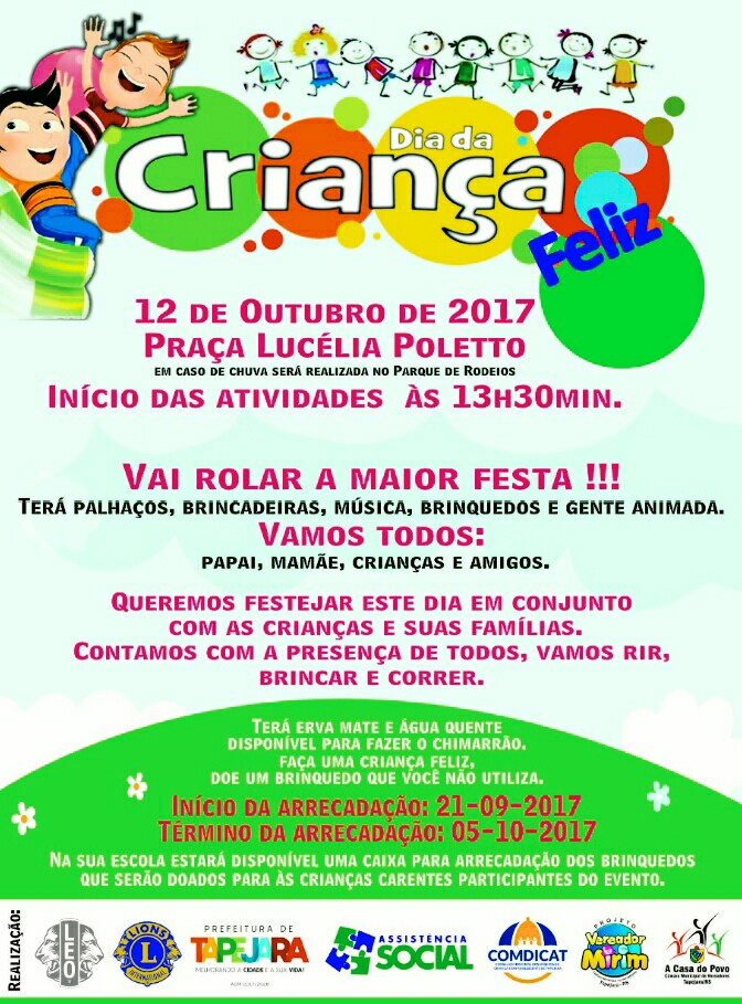 No mês de Outubro comemoramos o Dia das Crianças e neste ano haverá uma super festa. Dia 12 de Outubro, na Praça Lucélia Poletto você está convidado a festejar com a gente o Dia da Criança Feliz.