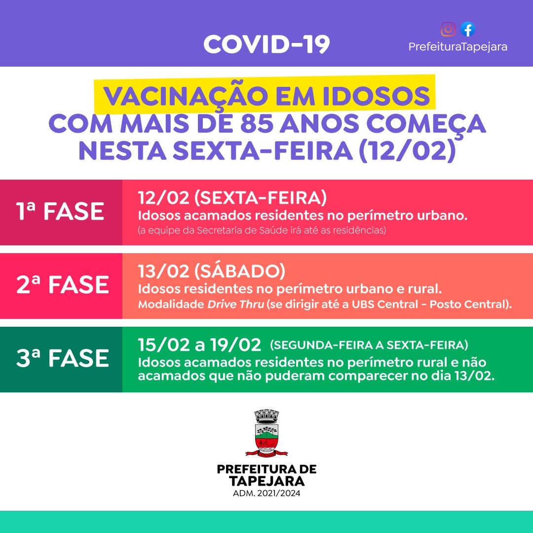 No próximo sábado (13), acontece a vacinação estilo drive thru, onde todos os idosos acima de 85 anos deverão ser levados de carro até o Posto de Saúde do centro para receber a dose da vacina.