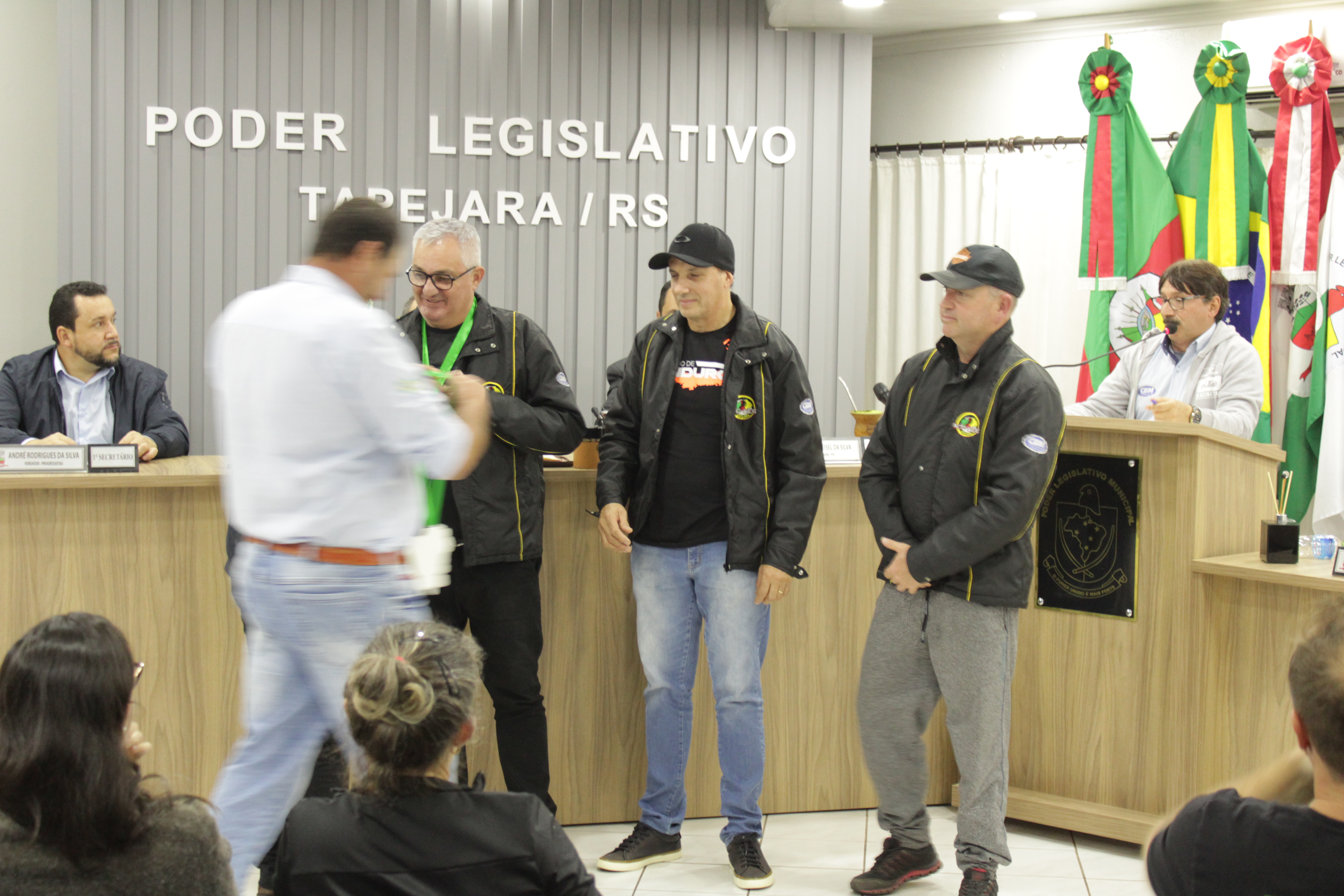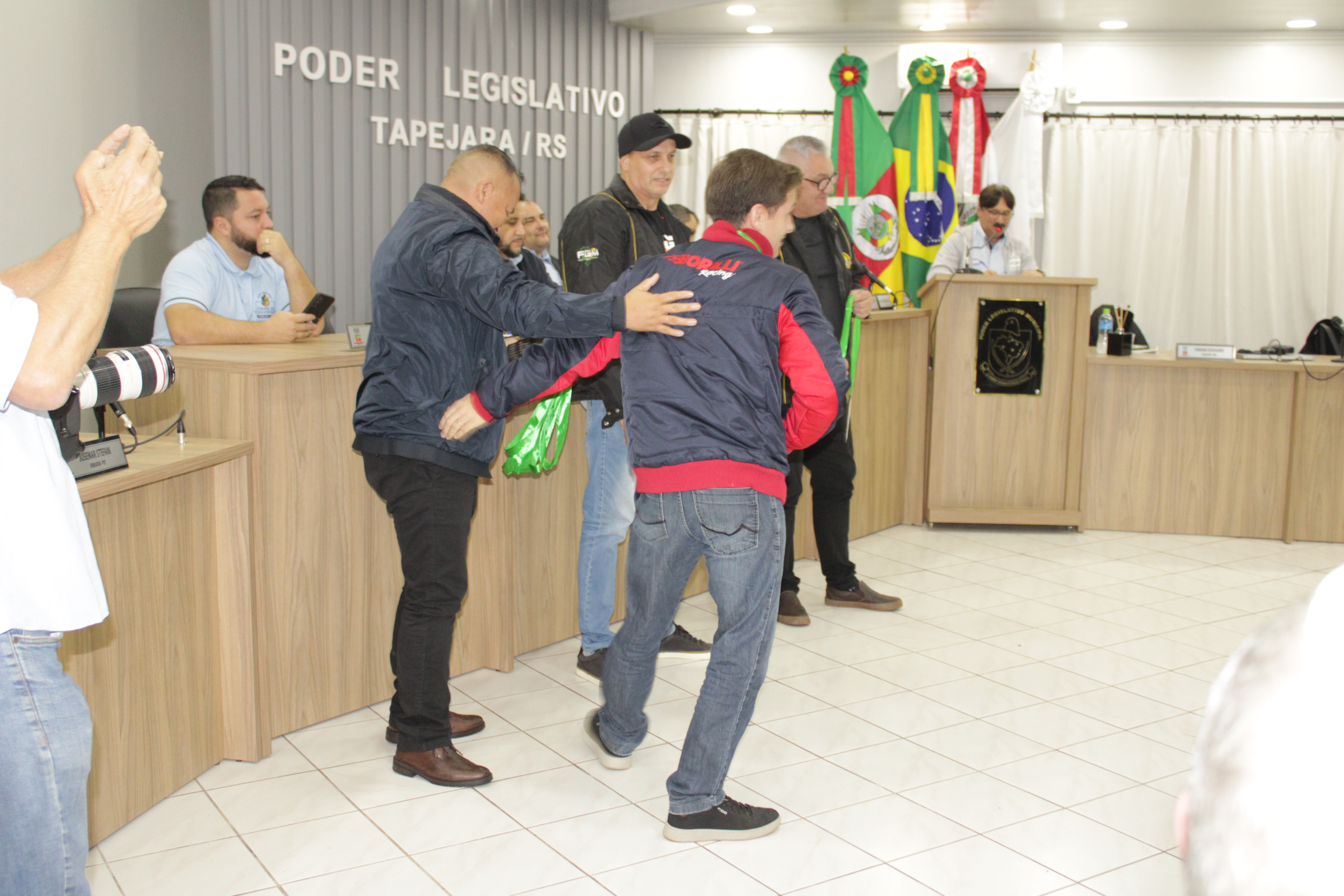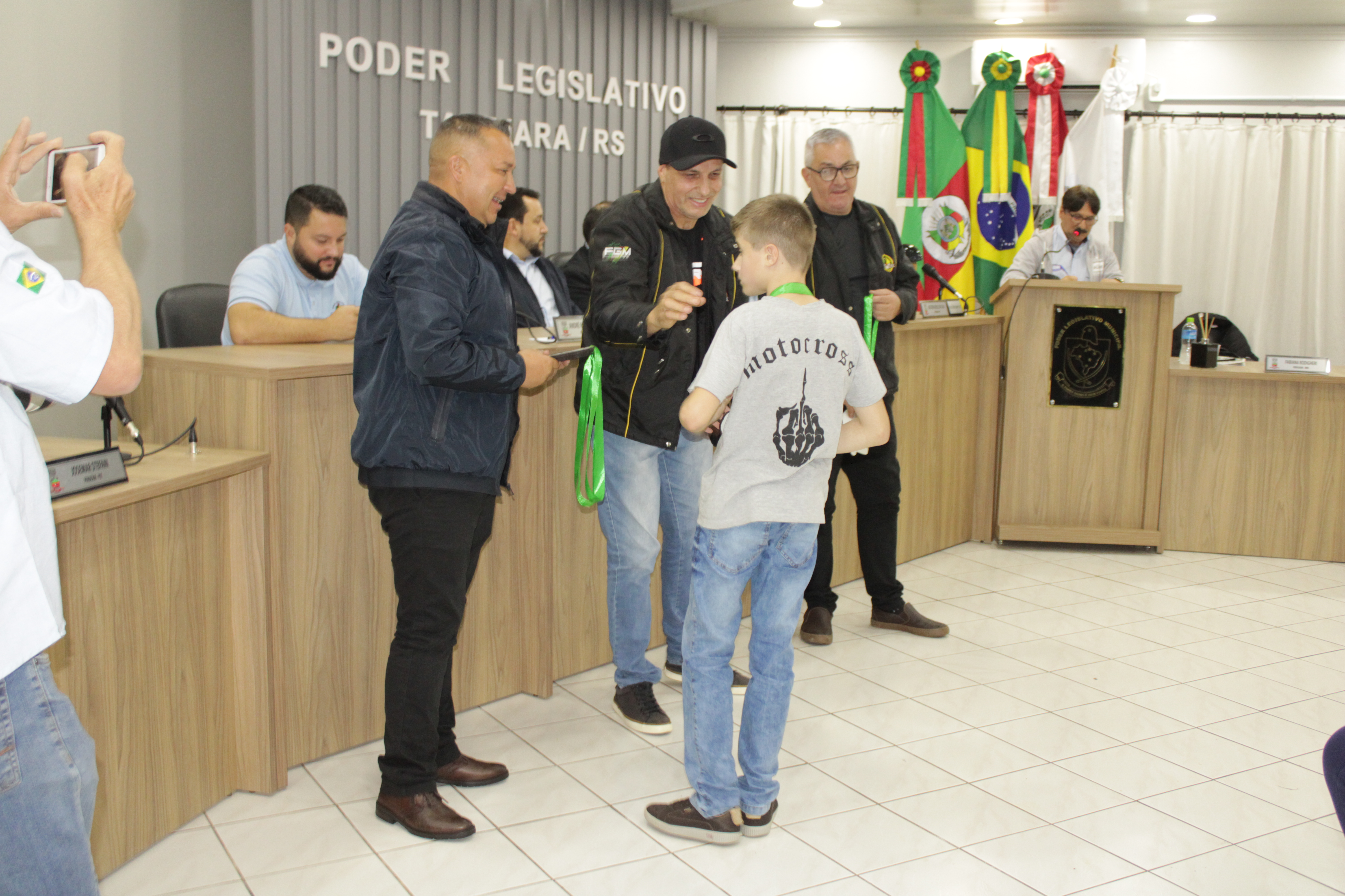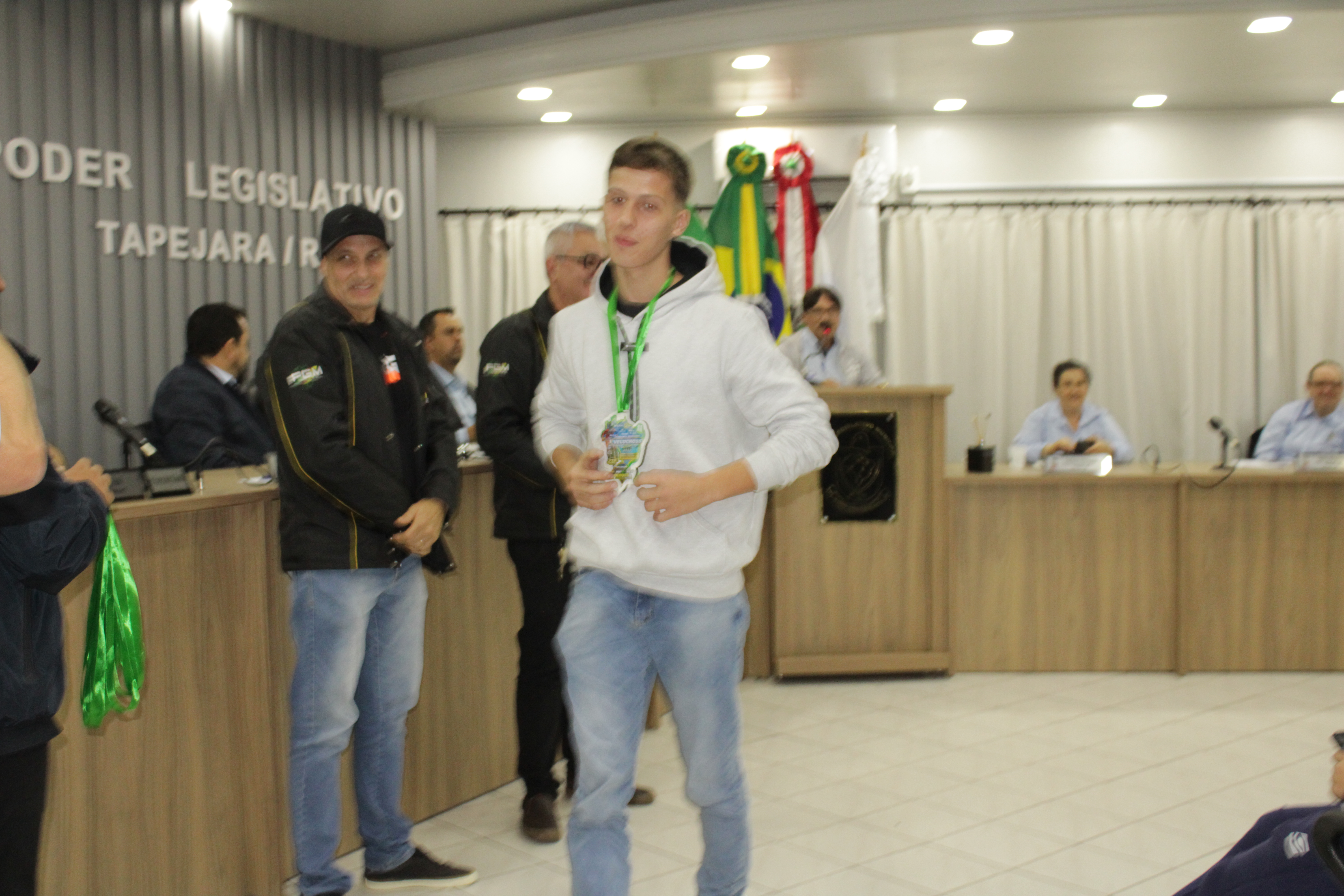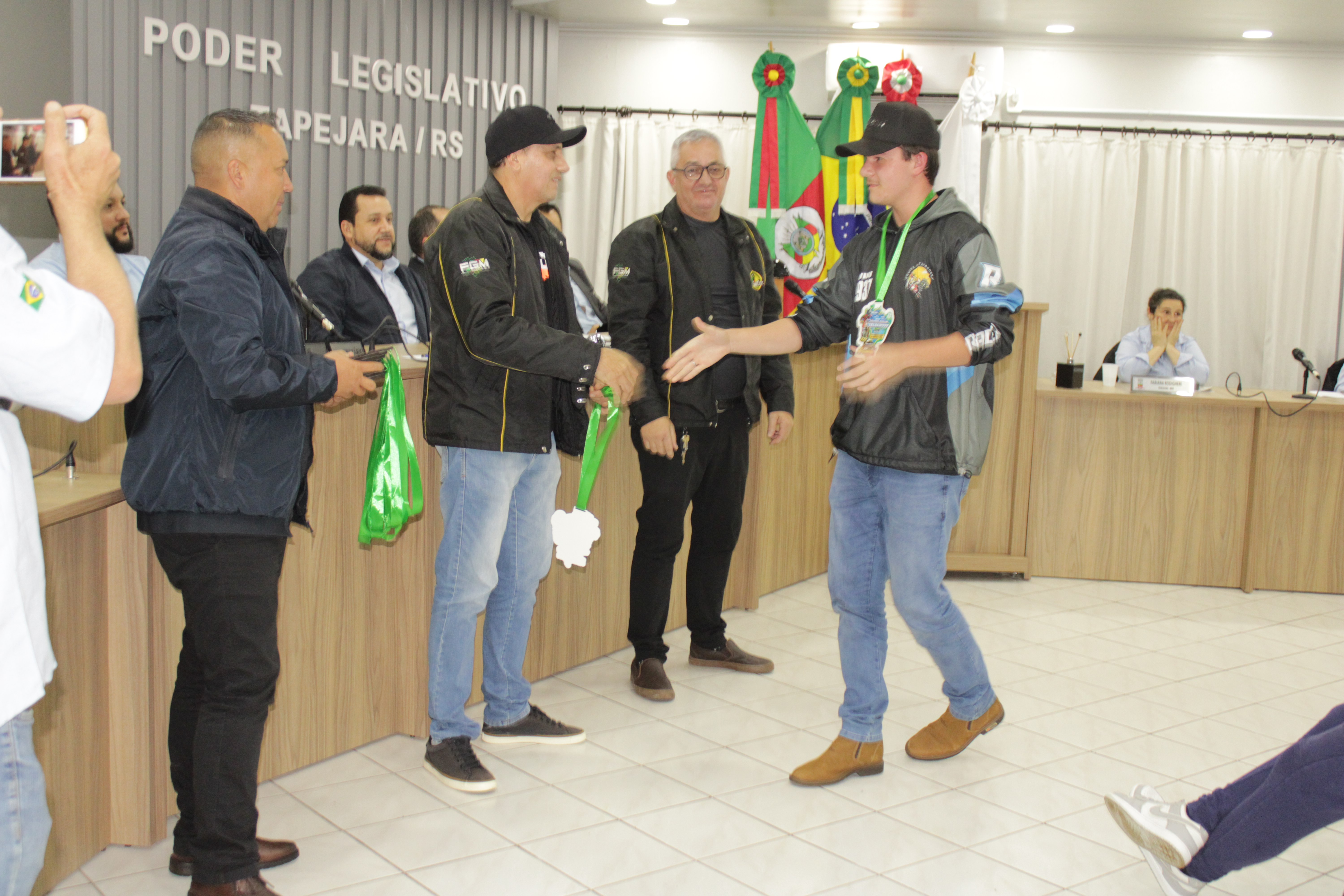 - Por solicitação do Prefeito Municipal Evanir Wolf, com anuência da Mesa Diretora desta Casa, fundamentado no artigo 41 alínea “o”; e no artigo 219 do nosso Regimento Interno, foi concedido o espaço de 05 minutos para que para que o Prefeito Municipal Evanir Wolf e o Vice Prefeito Rodinei Bruel, juntamente com o representante dos Pilotos de Tapejara: Willian Mioto, representando o Moto Clube de Tapejara: Roberto Urbanski e Representando a Federação Gaúcha de Motocross: Jair Silveira.