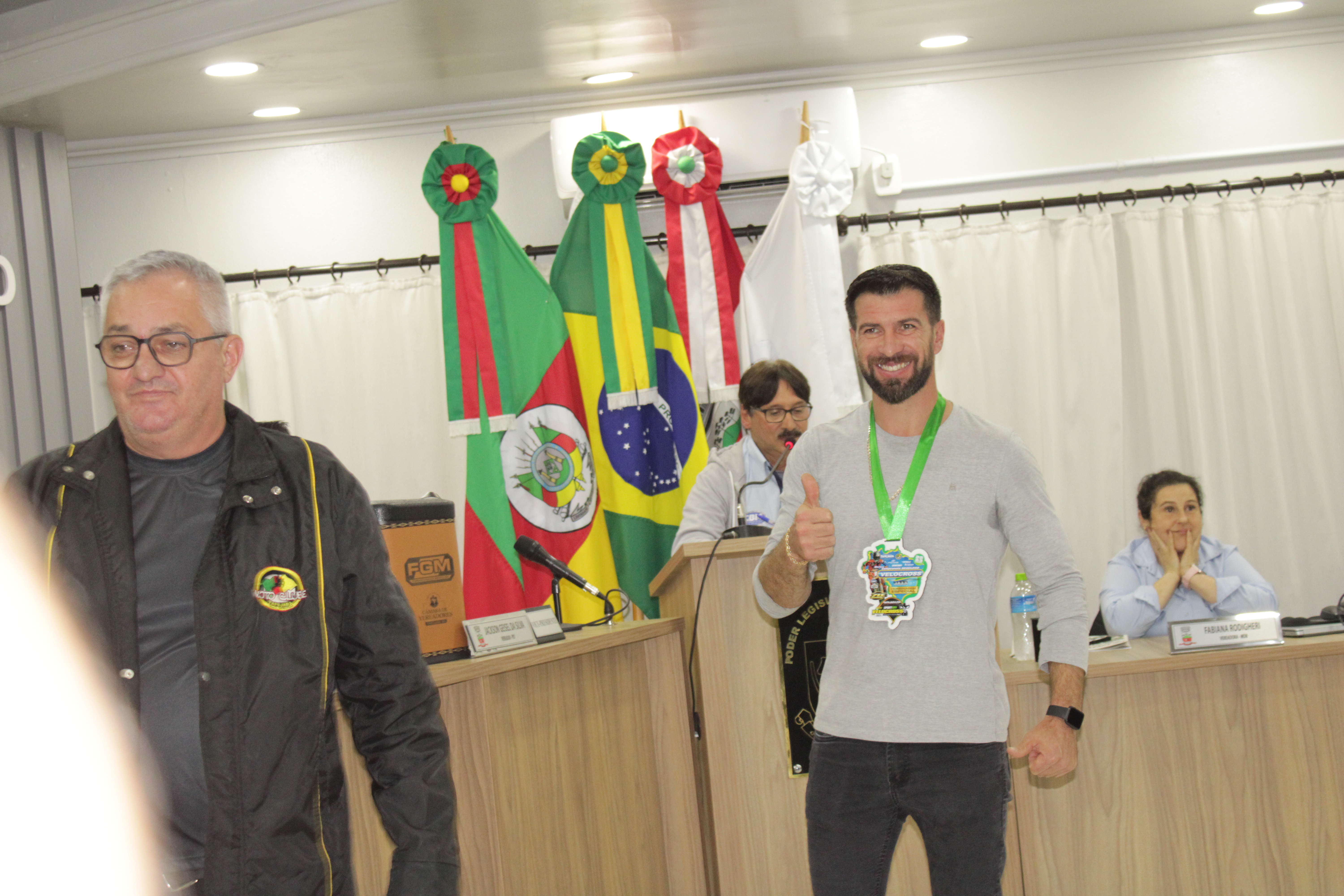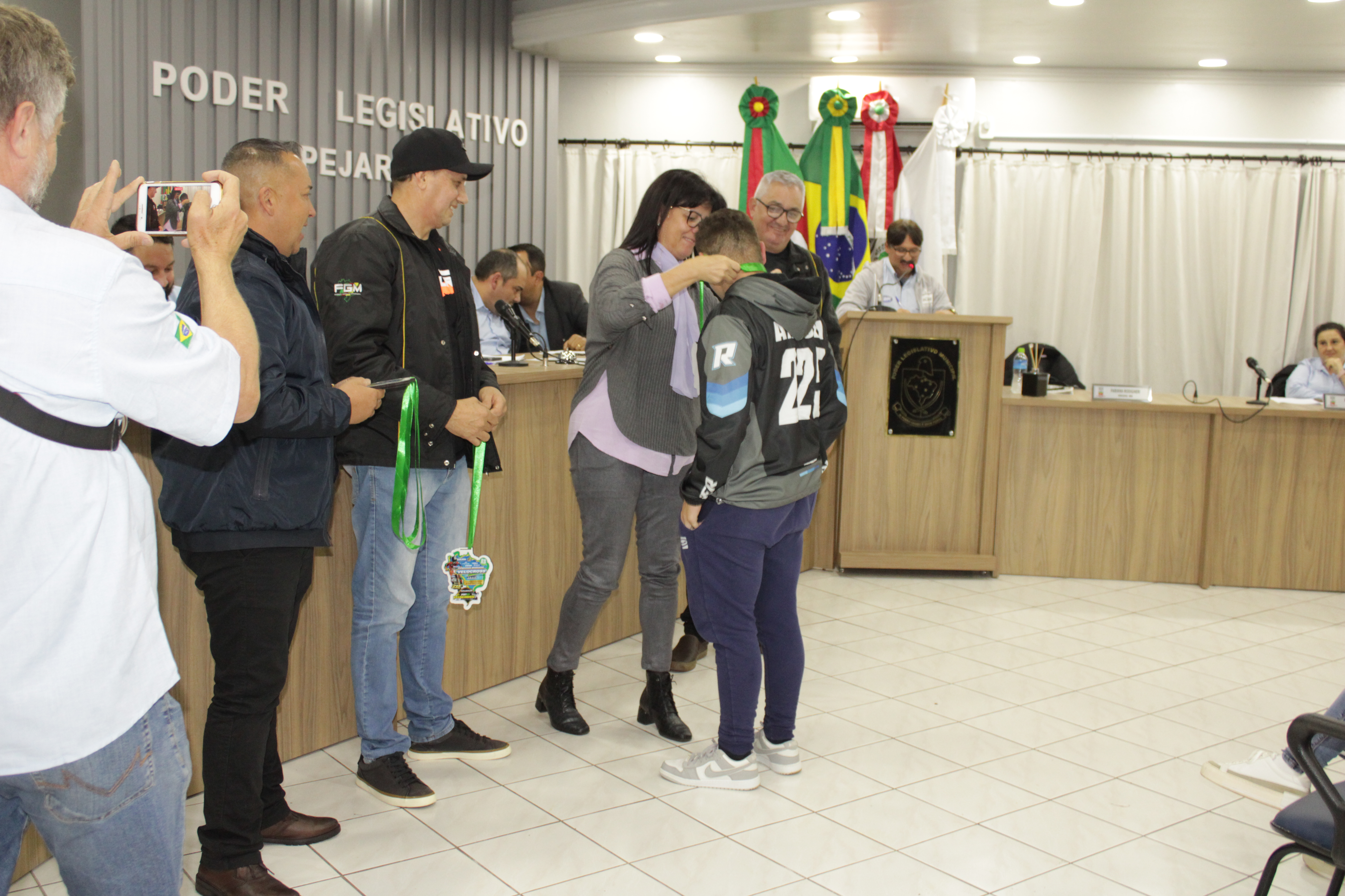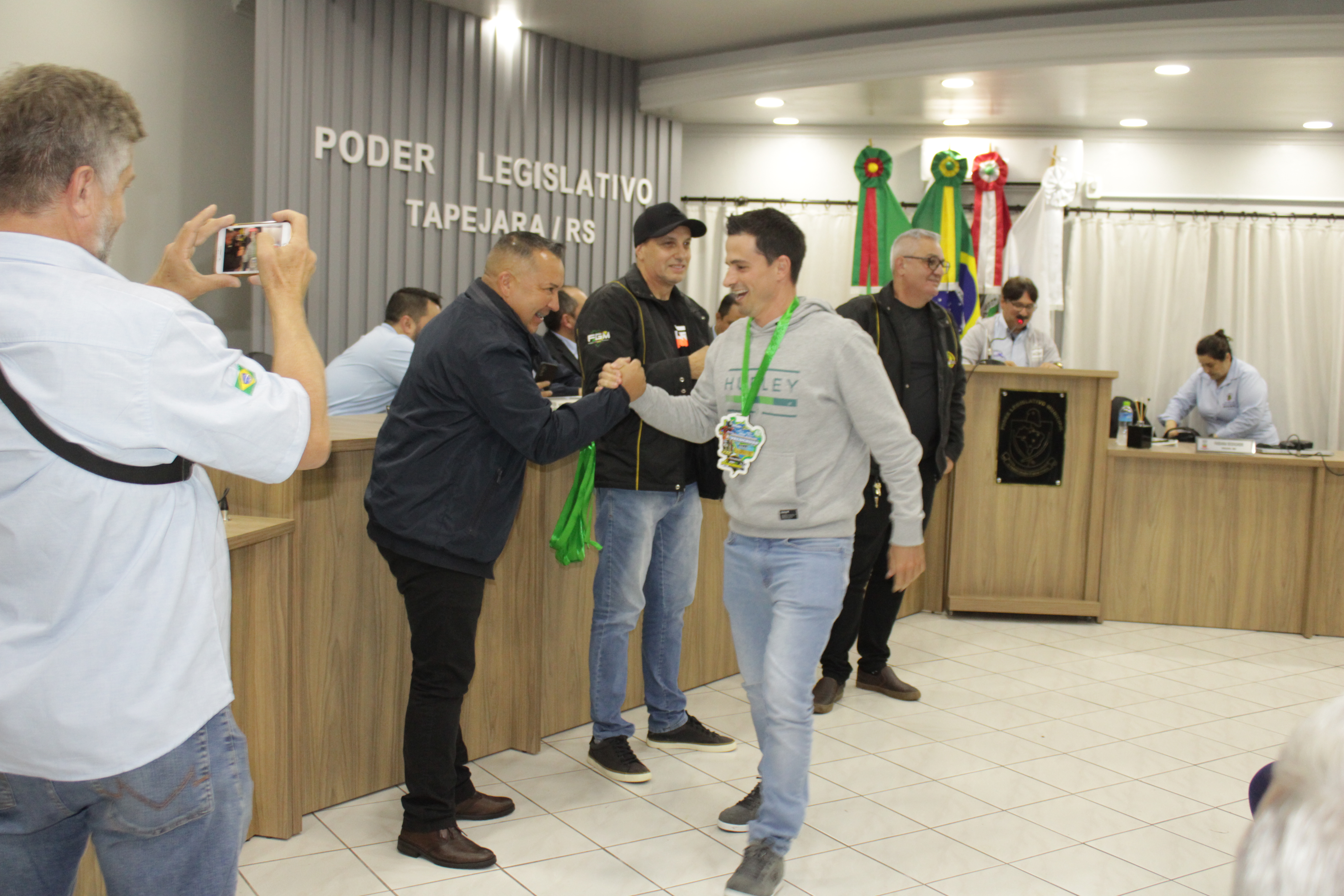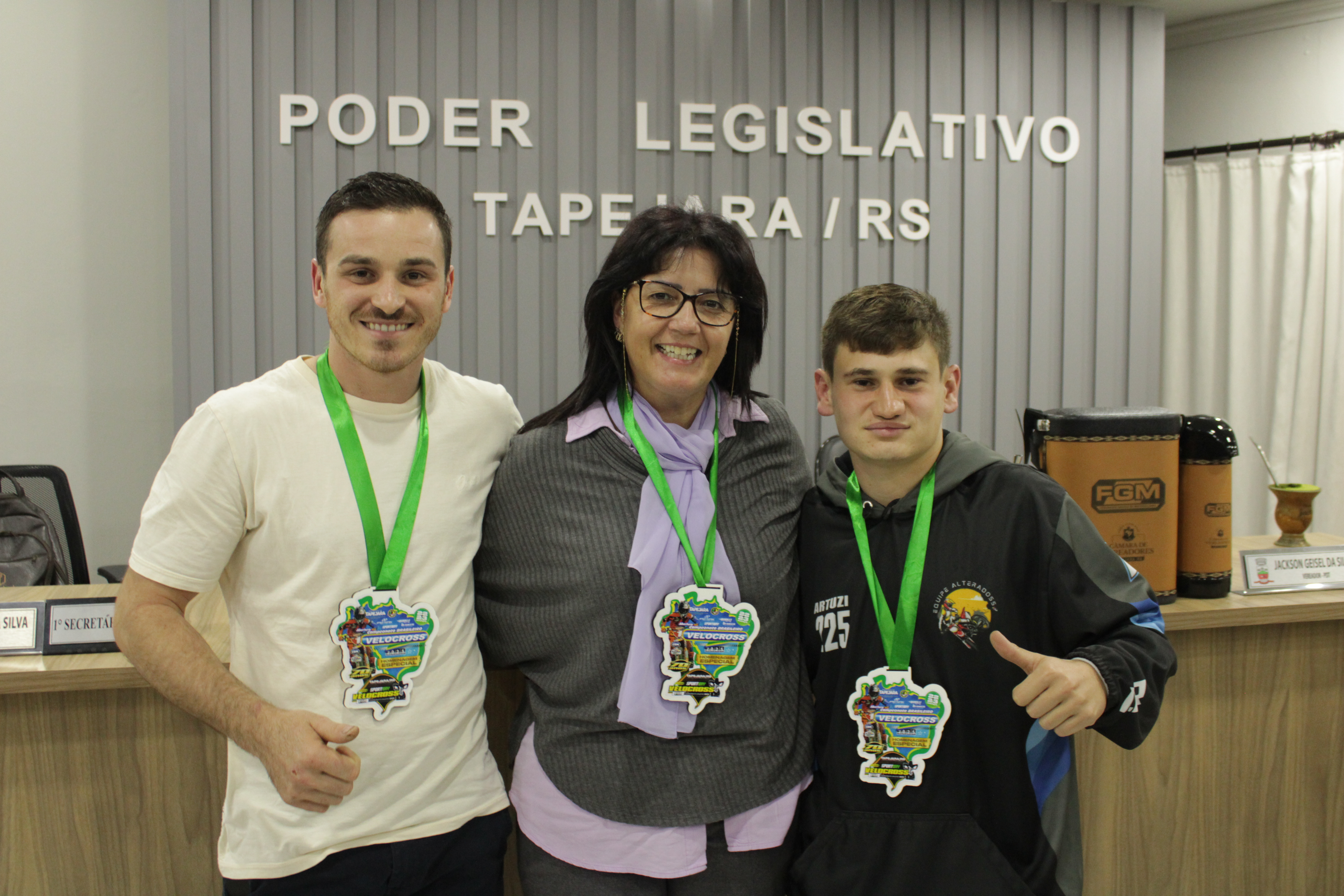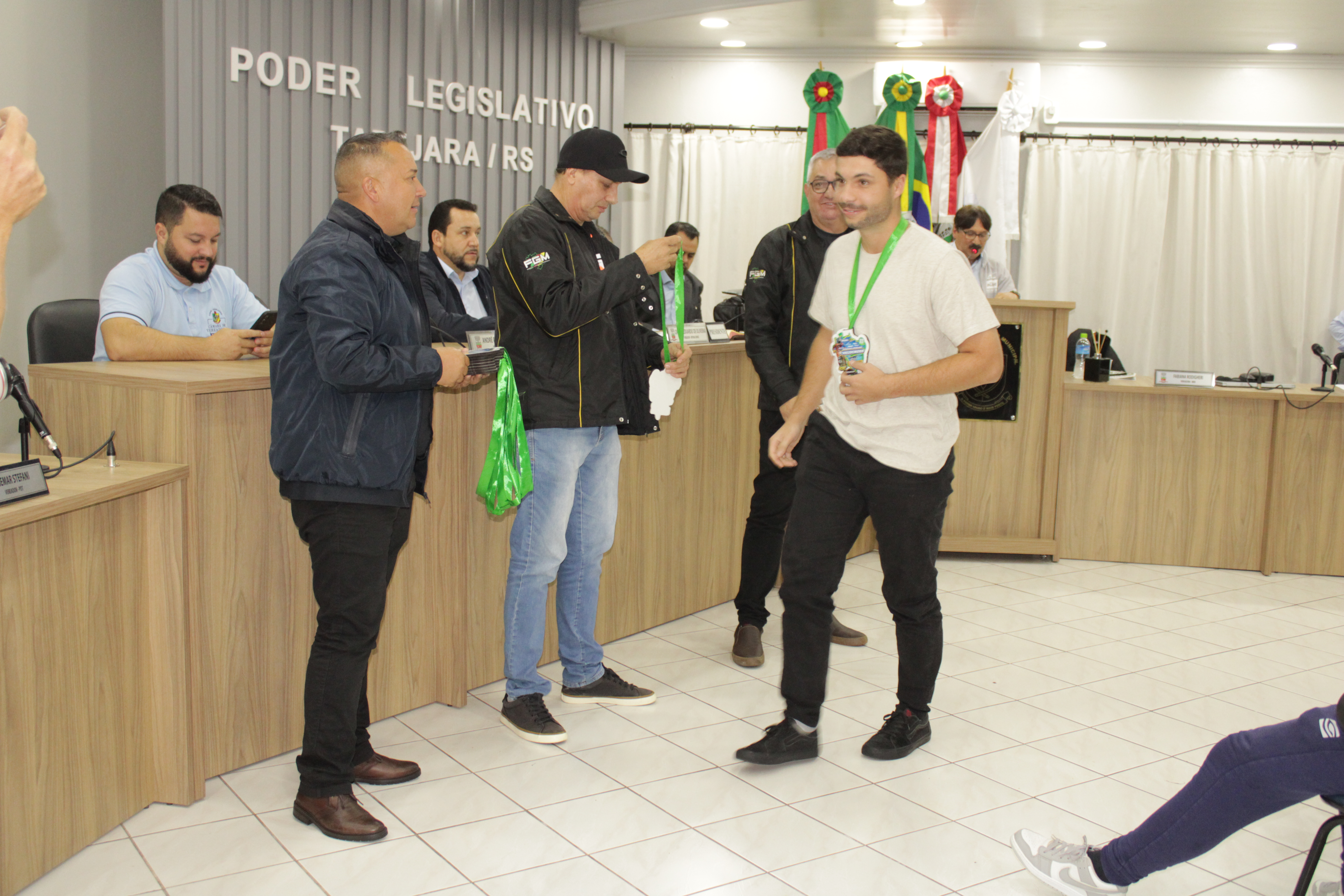 - Por solicitação do Prefeito Municipal Evanir Wolf, com anuência da Mesa Diretora desta Casa, fundamentado no artigo 41 alínea “o”; e no artigo 219 do nosso Regimento Interno, foi concedido o espaço de 05 minutos para que para que o Prefeito Municipal Evanir Wolf e o Vice Prefeito Rodinei Bruel, juntamente com o representante dos Pilotos de Tapejara: Willian Mioto, representando o Moto Clube de Tapejara: Roberto Urbanski e Representando a Federação Gaúcha de Motocross: Jair Silveira.