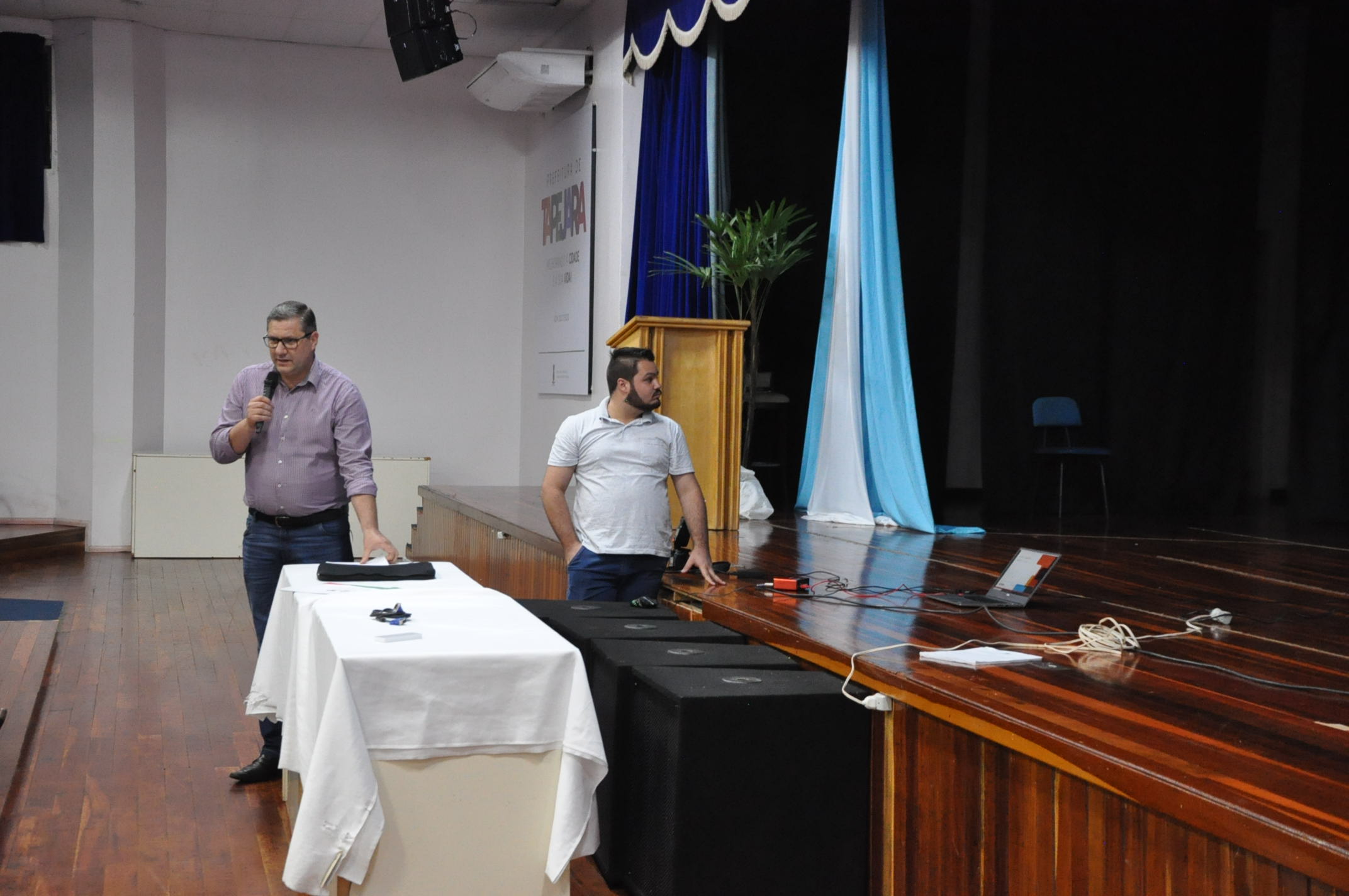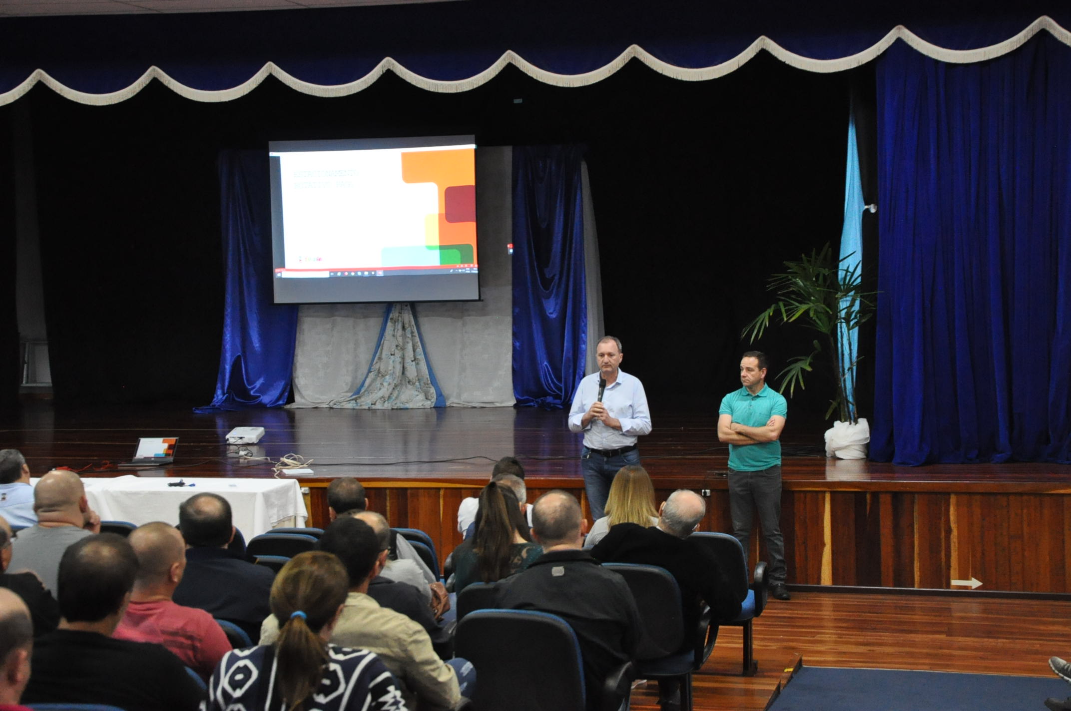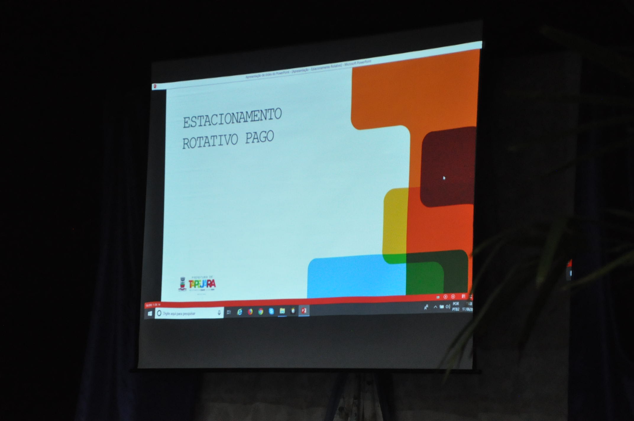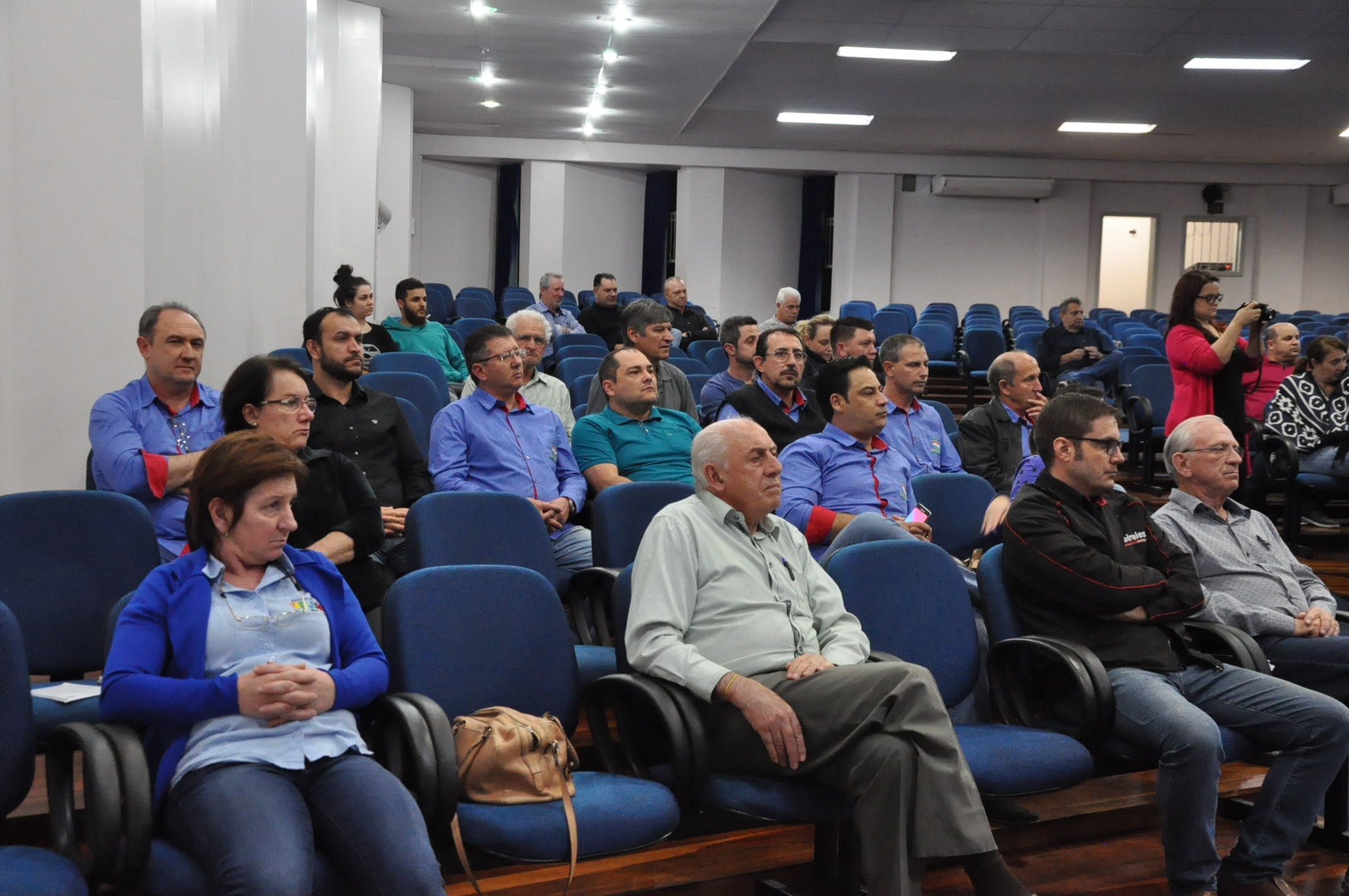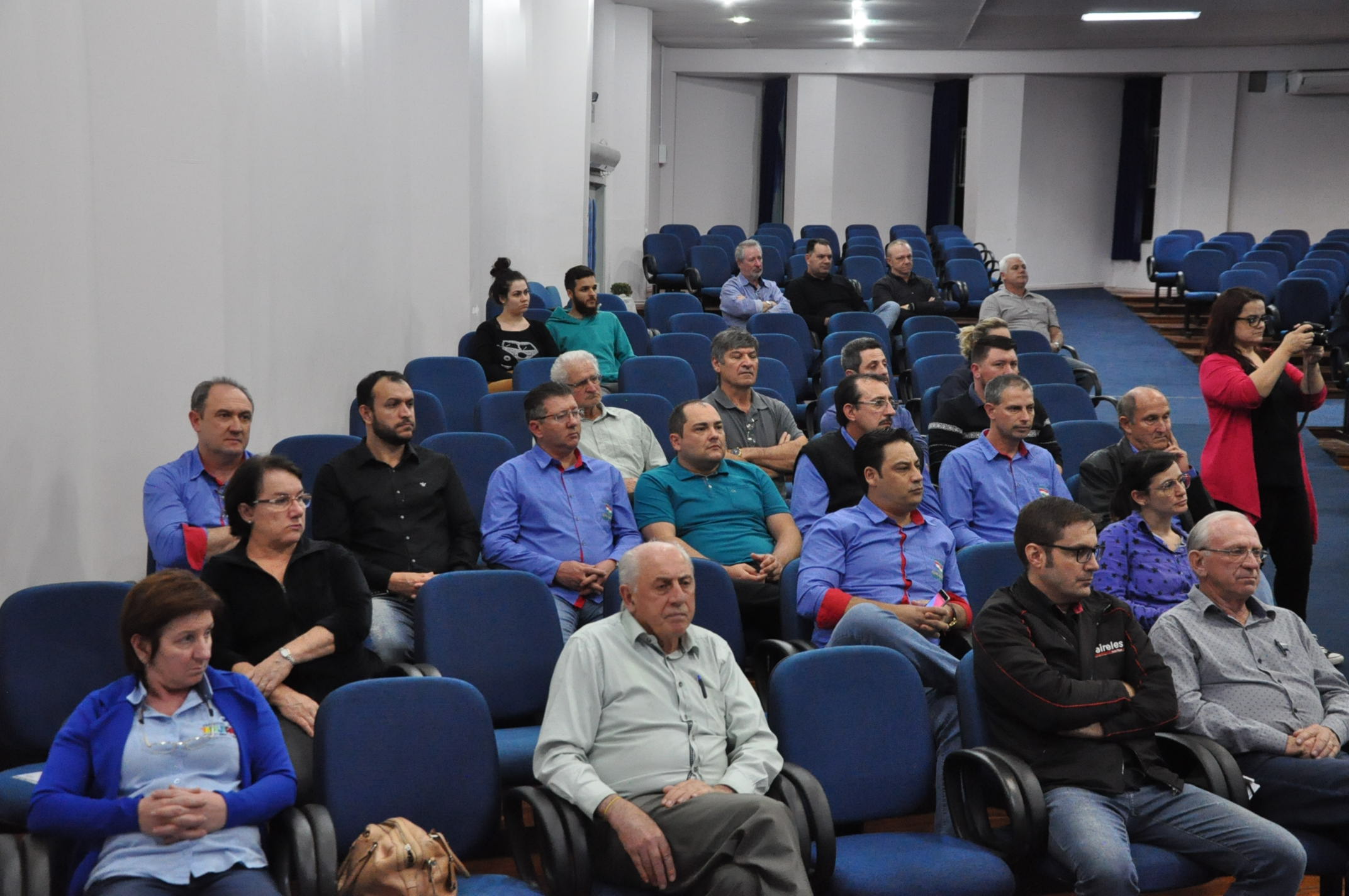 O presidente da Câmara de Vereadores, Altamir Galvão Waltrich e os vereadores: Carlos Eduardo de Oliveira, Celso Piffer, Daniel Kadini, Diego de Oliveira, Gilberto Scariot, Hugo Dalposso, Paulo Cesar Lângaro, Rodinei Bruel, Volmir Oreste Danelli, Zalmair Roier, estão participando no Centro Cultural da Audiência Pública sobre a implantação de estacionamento público rotativo pago em vias do Município.