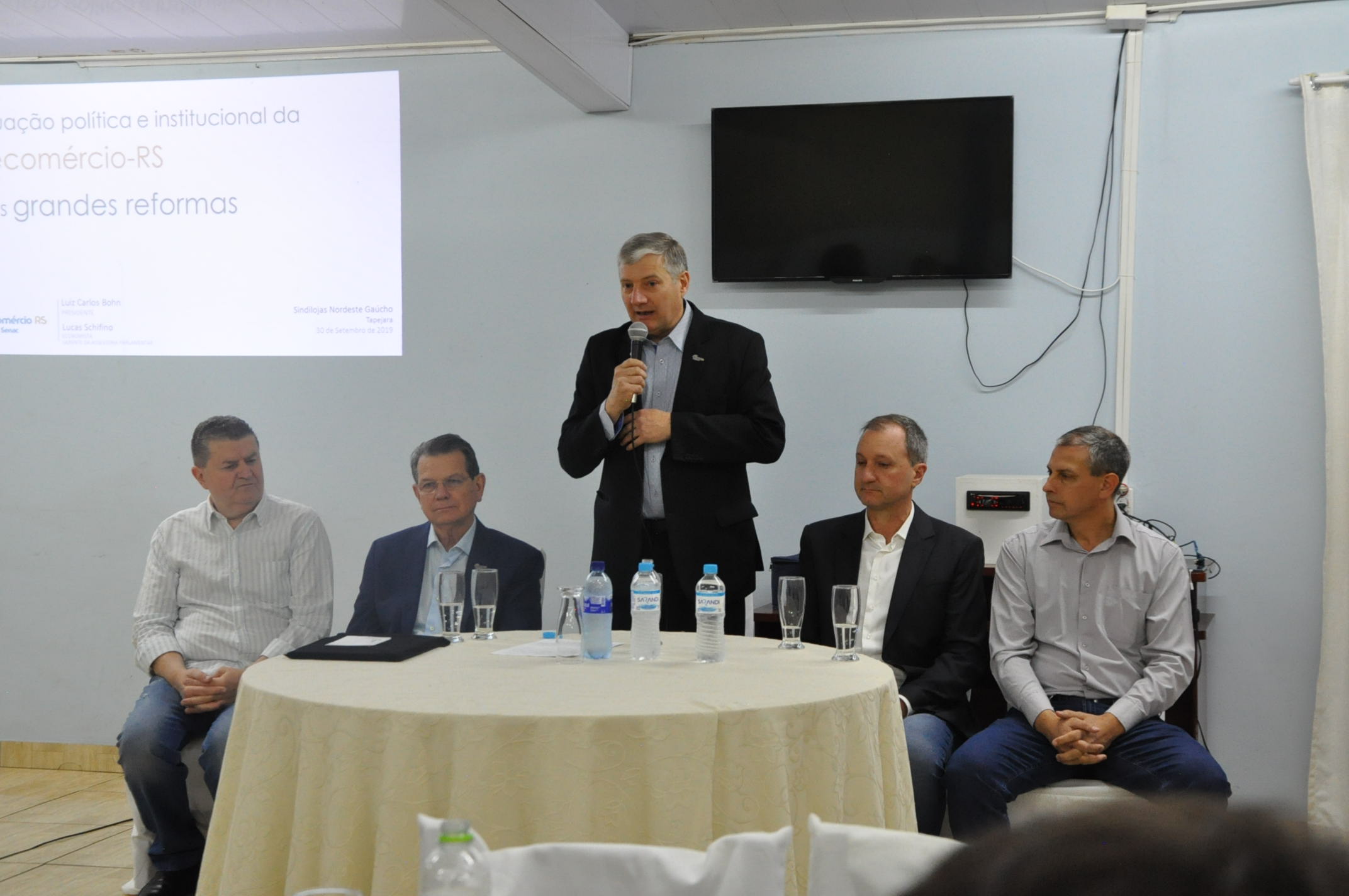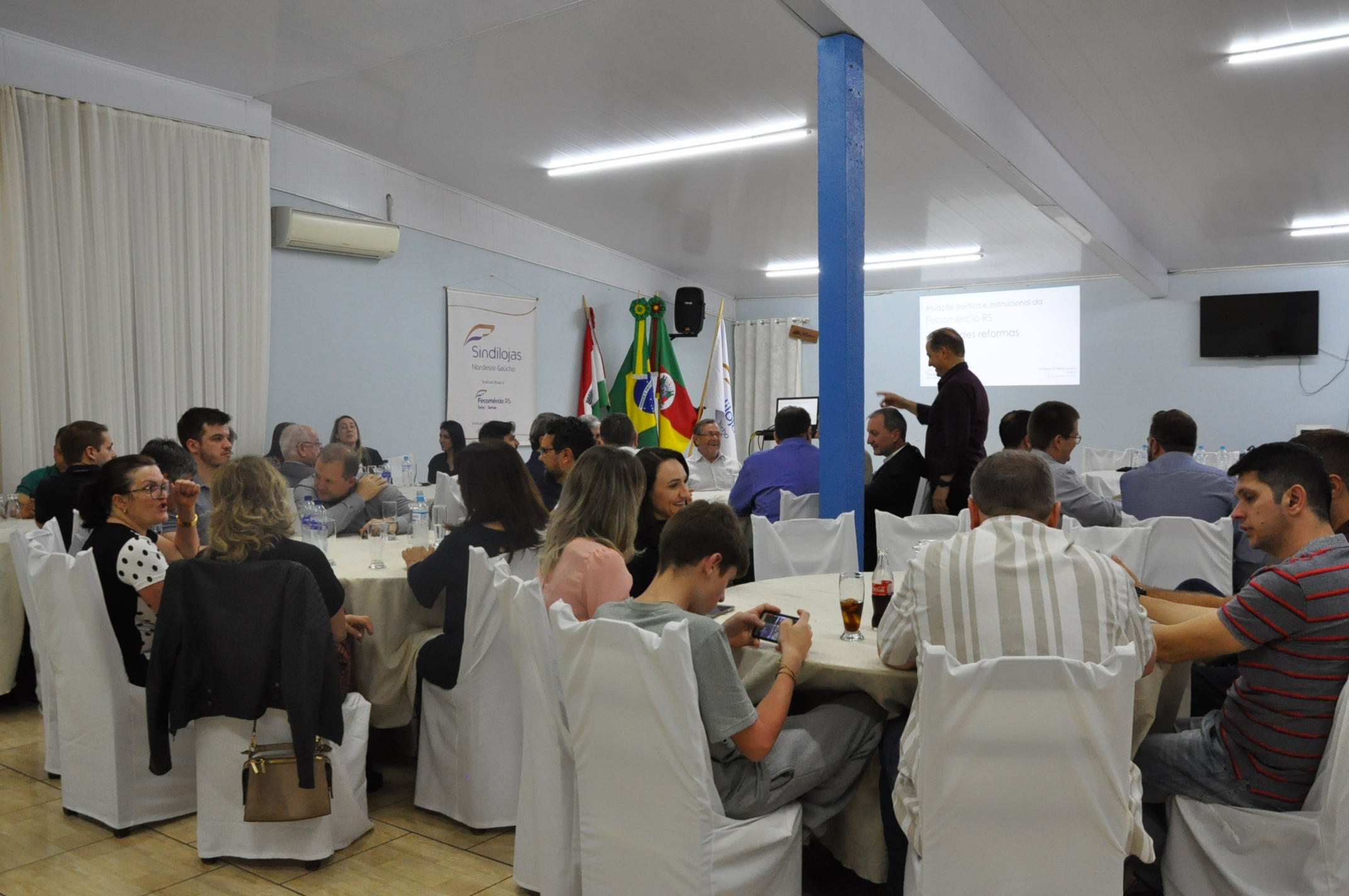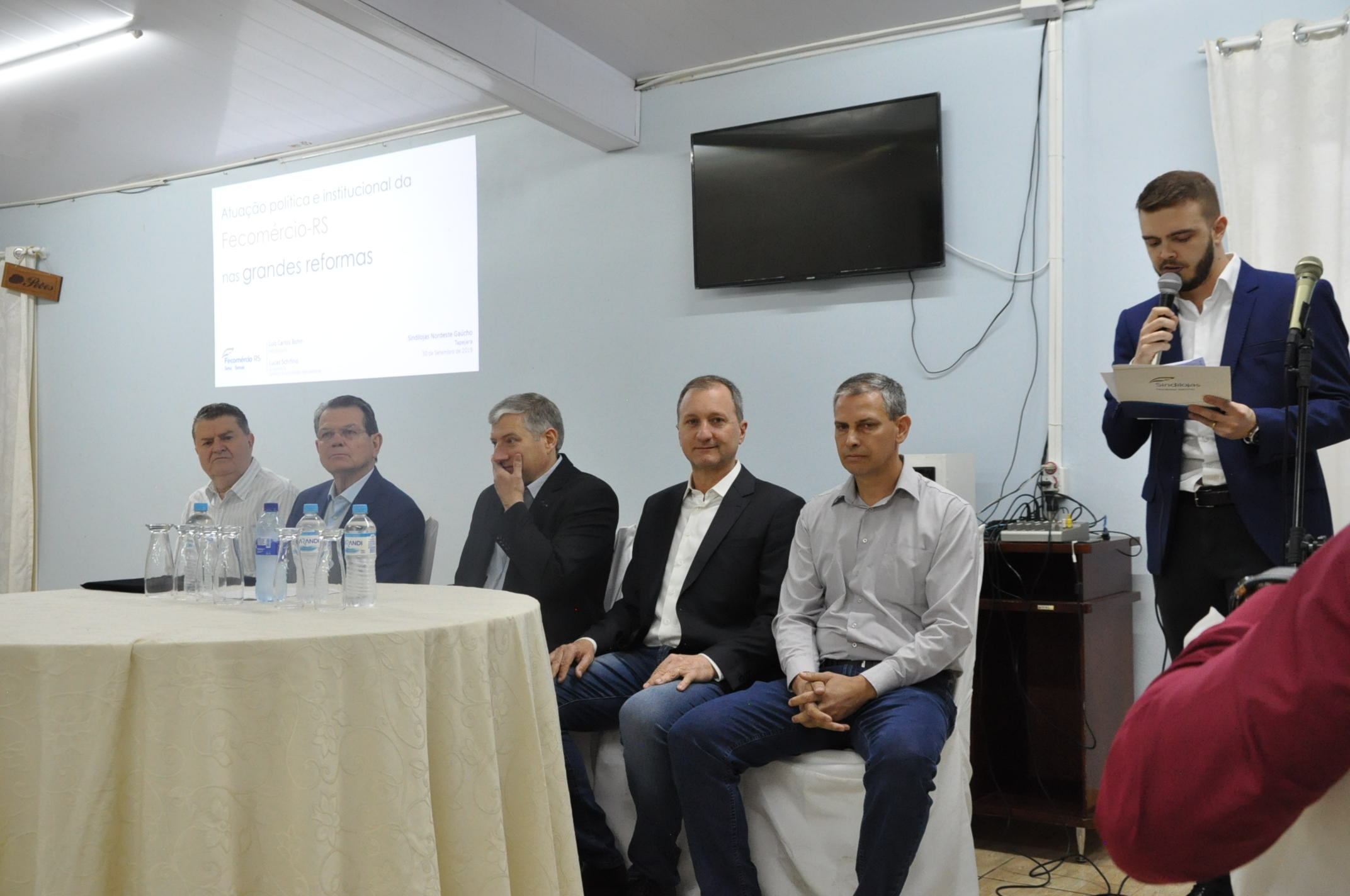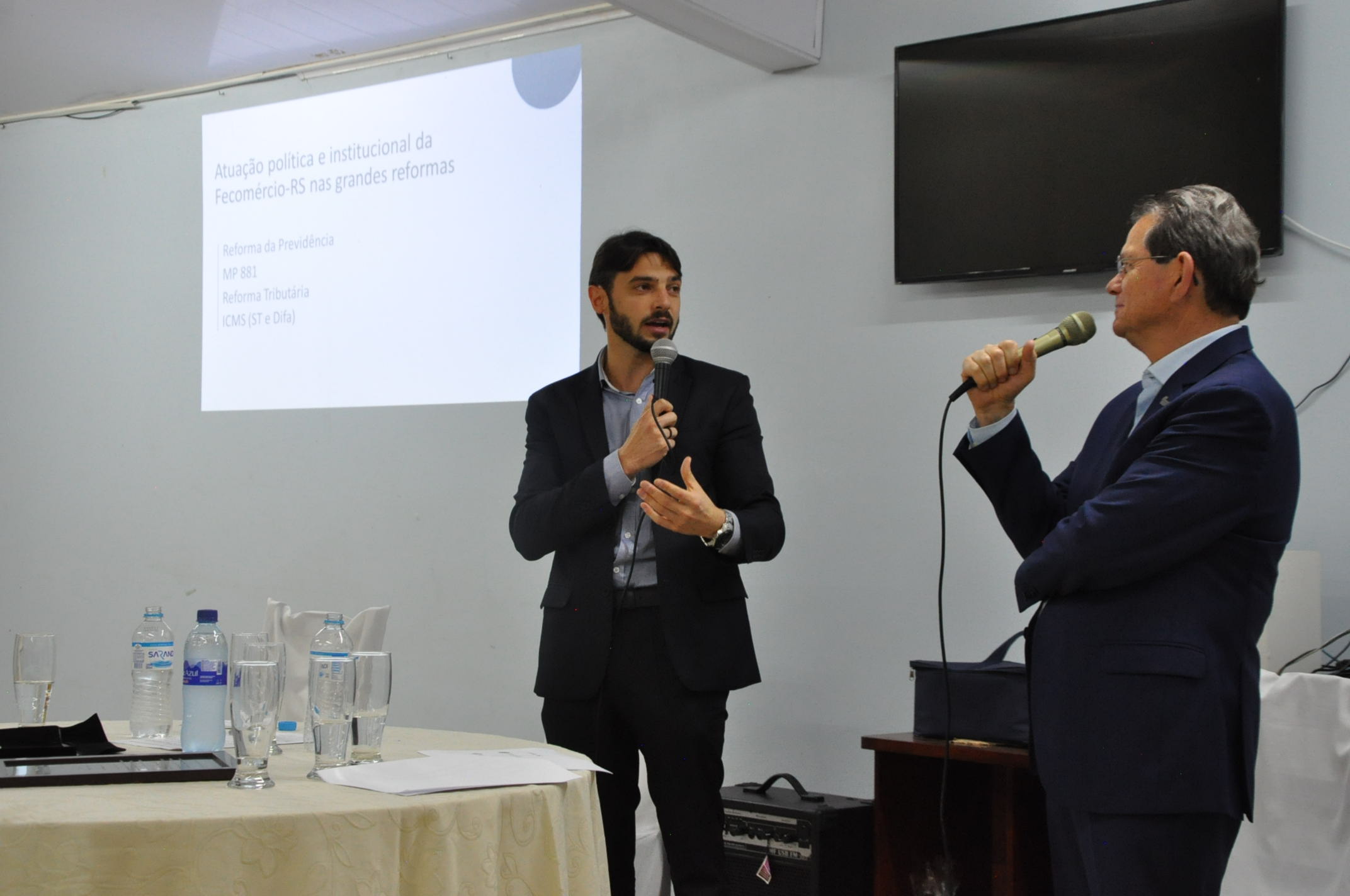 Na ocasião, o presidente da Fecomércio, Luiz Carlos Bohn, e o economista, Lucas Schifino, abordaram o tema “Atuação Política e Institucional da Fecomércio nas Grandes Reformas”. Também falaram sobre a economia brasileira e mundial, Reforma da Previdência, Reforma Tributária e Medida Provisória (MP) da Liberdade Econômica.